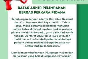 PENGUMUMAN Sehubungan dengan adanya Hari Libur Nasional dan Cuti Bersama Hari Raya Idul Fitri Tahun 2025, maka bersama ini kami beritahukan bahwa batas akhir pelimpahan berkas perkara pidana melalui E-Berpadu, yaitu pada hari Kamis tanggal 20 Maret 2025 Pukul 14.00 Wib. dan mulai menerima kembali pelimpahan berkas perkara pidana melalui…
