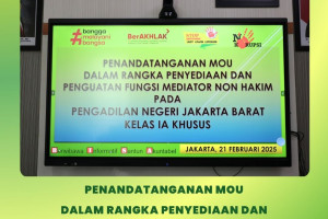 *PNJB, 21 Februari 2025* - Ketua Pengadilan Negeri Jakarta Barat, Bapak Dr. Dahlan, S.H., M.H., memimpin penandatanganan MoU Mediator Non Hakim yang didampingi oleh Wakil Ketua Pengadilan Negeri Jakarta Barat, Bapak Achmad Satibi, S.H., M.H., Panitera, Sekretaris serta Koordinator Mediator Non Hakim dan Para Mediator Non Hakim dari Pengadilan Negeri Jakarta Barat turut…