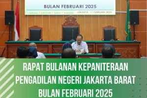 *PNJB, 17 Februari 2025* Bertempat di Ruang Sidang Utama Kusuma Atmadja, Hari ini telah dilaksanakan Rapat Kepaniteraan bulan Februari 2025 yang dipimpin oleh Panitera Pengadilan Negeri Jakarta Barat Kelas IA Khusus, Bapak Iyus Yusuf, S.H., M.H. Rapat ini diadakan dengan tujuan mengoptimalkan kinerja Panitera Pengganti dalam membantu Hakim / Majelis Hakim dengan…