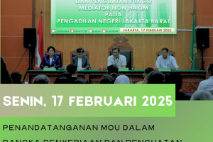 *PNJB, 17 Februari 2025* - Ketua Pengadilan Negeri Jakarta Barat, Bapak Dr. Dahlan, S.H., M.H., memimpin penandatanganan MoU Mediator Non Hakim yang didampingi oleh Wakil Ketua Pengadilan Negeri Jakarta Barat, Bapak Achmad Satibi, S.H., M.H., Panitera, Kabag Umum, Panitera Muda Hukum serta Koordinator Mediator Non Hakim, Ibu Susy Tan, SH., MH. Para…