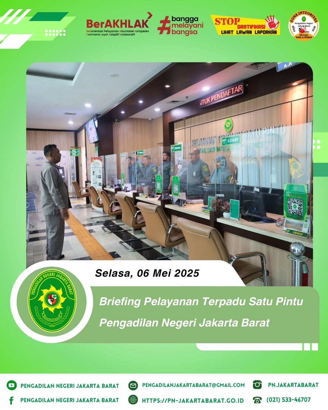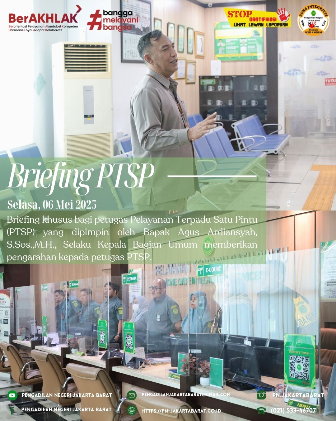 *PNJB, 06 Mei 2025* - Bertempat di lobi PTSP Pengadilan Negeri Jakarta Barat, telah diadakan briefing khusus bagi petugas Pelayanan Terpadu Satu Pintu (PTSP) yang dipimpin oleh Bapak Agus Ardiansyah S.Sos., M.H., selaku Kepala Bagian Umum