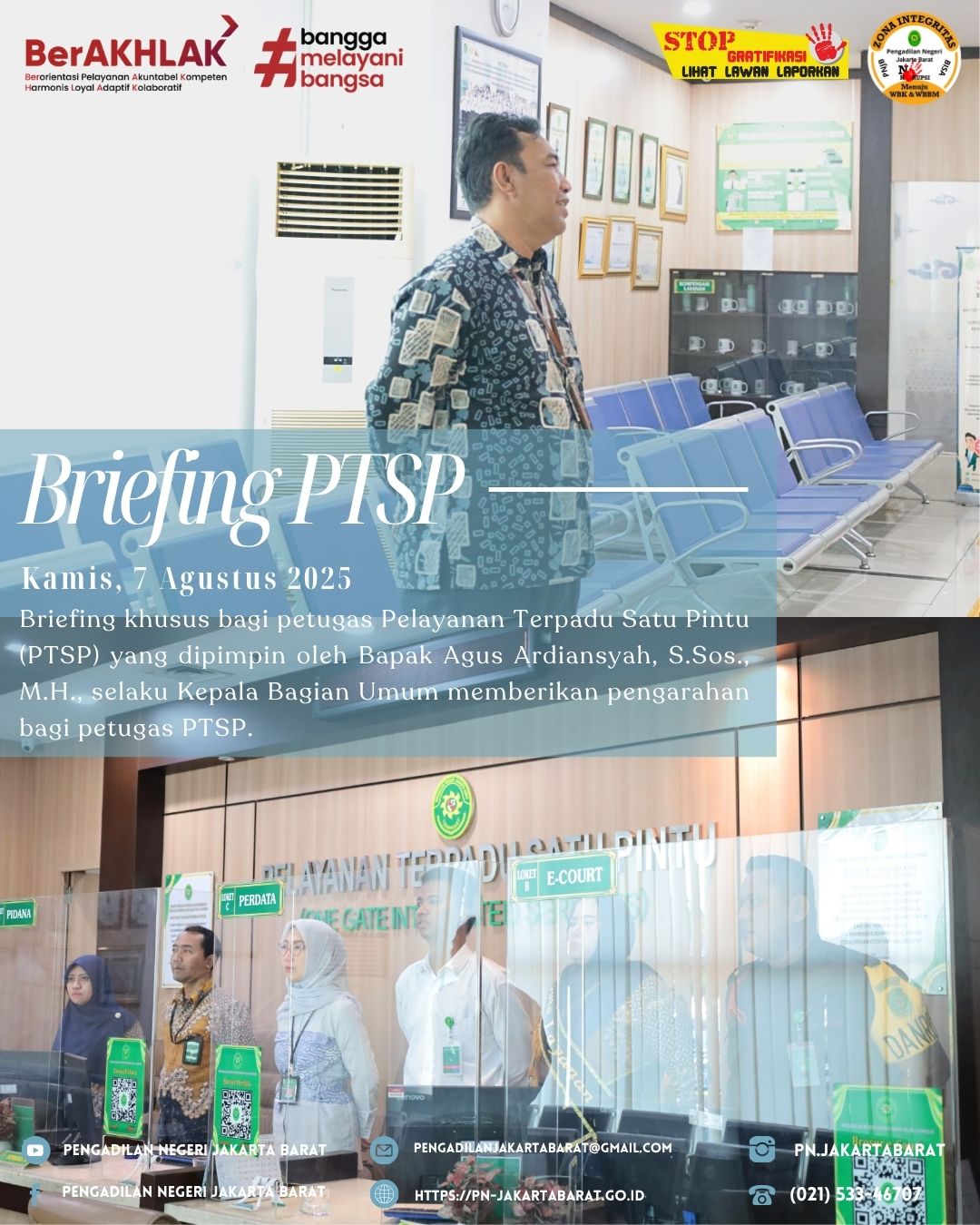 Bertempat di lobi PTSP Pengadilan Negeri Jakarta Barat, telah diadakan briefing khusus bagi petugas Pelayanan Terpadu Satu Pintu (PTSP) yang dipimpin oleh Bapak Agus Ardiansyah S.Sos., M.H., selaku Kepala Bagian Umum