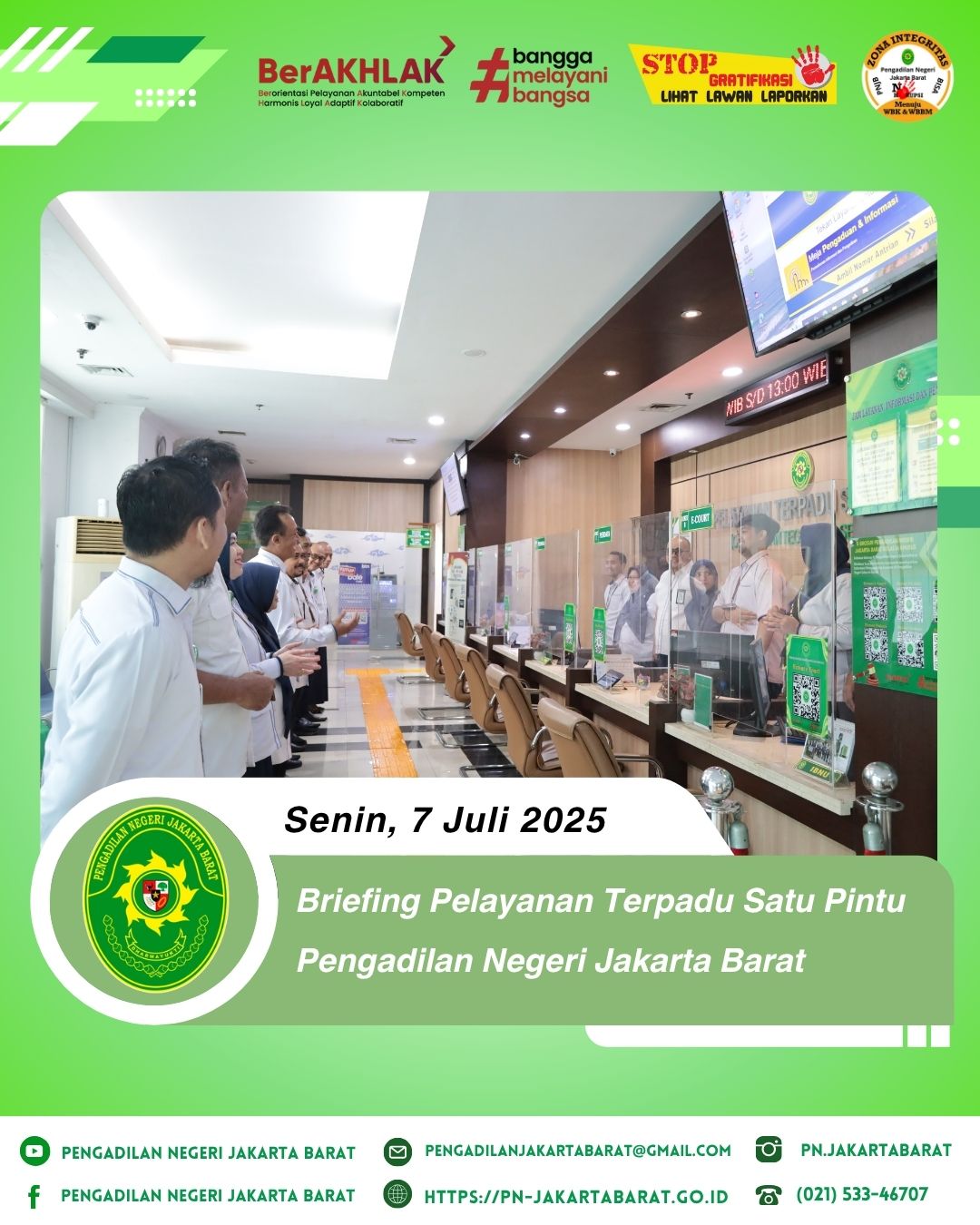 *PNJB, 7 Juli 2025* - Briefing Pelayanan Terpadu Satu Pintu (PTSP) yang berlangsung di lobi PTSP Pengadilan Negeri Jakarta Barat dipimpin oleh Wakil Ketua Pengadilan Negeri Jakarta Barat, Bapak Iwan Anggoro Warsita, S.H., M.Hum., bersama Bapak Demi Hadiantoro, S.H., M.H., dan Ibu Febri Purnamavita, S.H., M.H., selaku Hakim Pengawas PTSP, Panitera dan Sekretaris selaku pengelola PTSP, dan para Panitera Muda dan Kepala Sub Bagian selaku penanggung jawab harian.