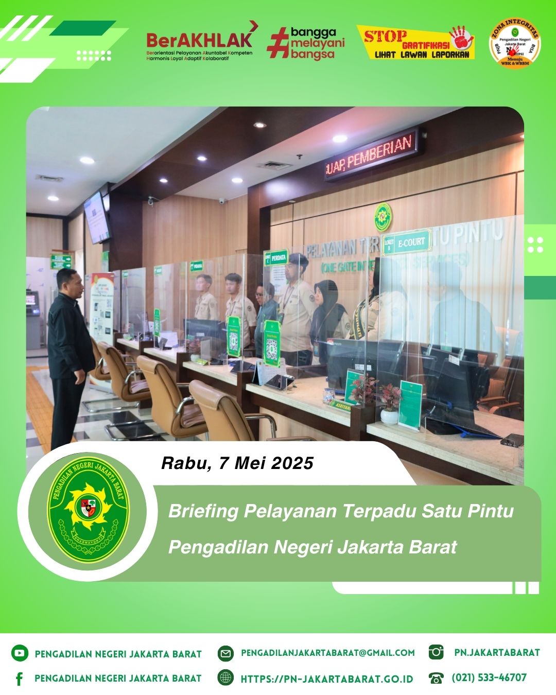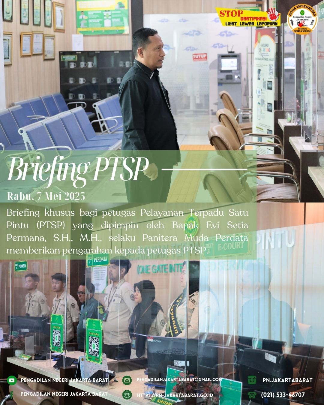 *PNJB, 7 Mei 2025* - Bertempat di lobi PTSP Pengadilan Negeri Jakarta Barat, telah diadakan briefing khusus bagi petugas Pelayanan Terpadu Satu Pintu (PTSP) yang dipimpin oleh Panitera Muda Perdata, Bapak Evi Setia Permana, S.H., M.H.