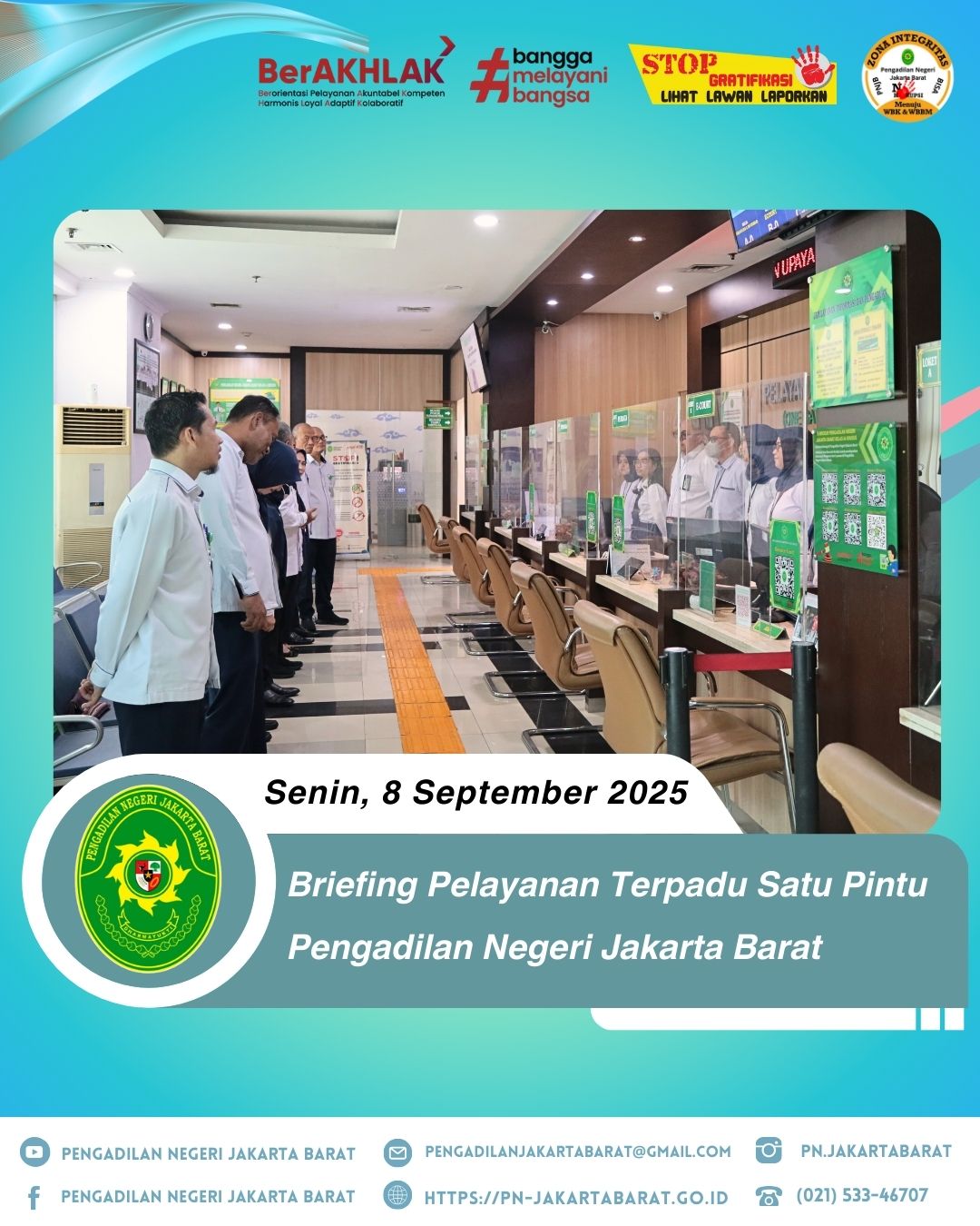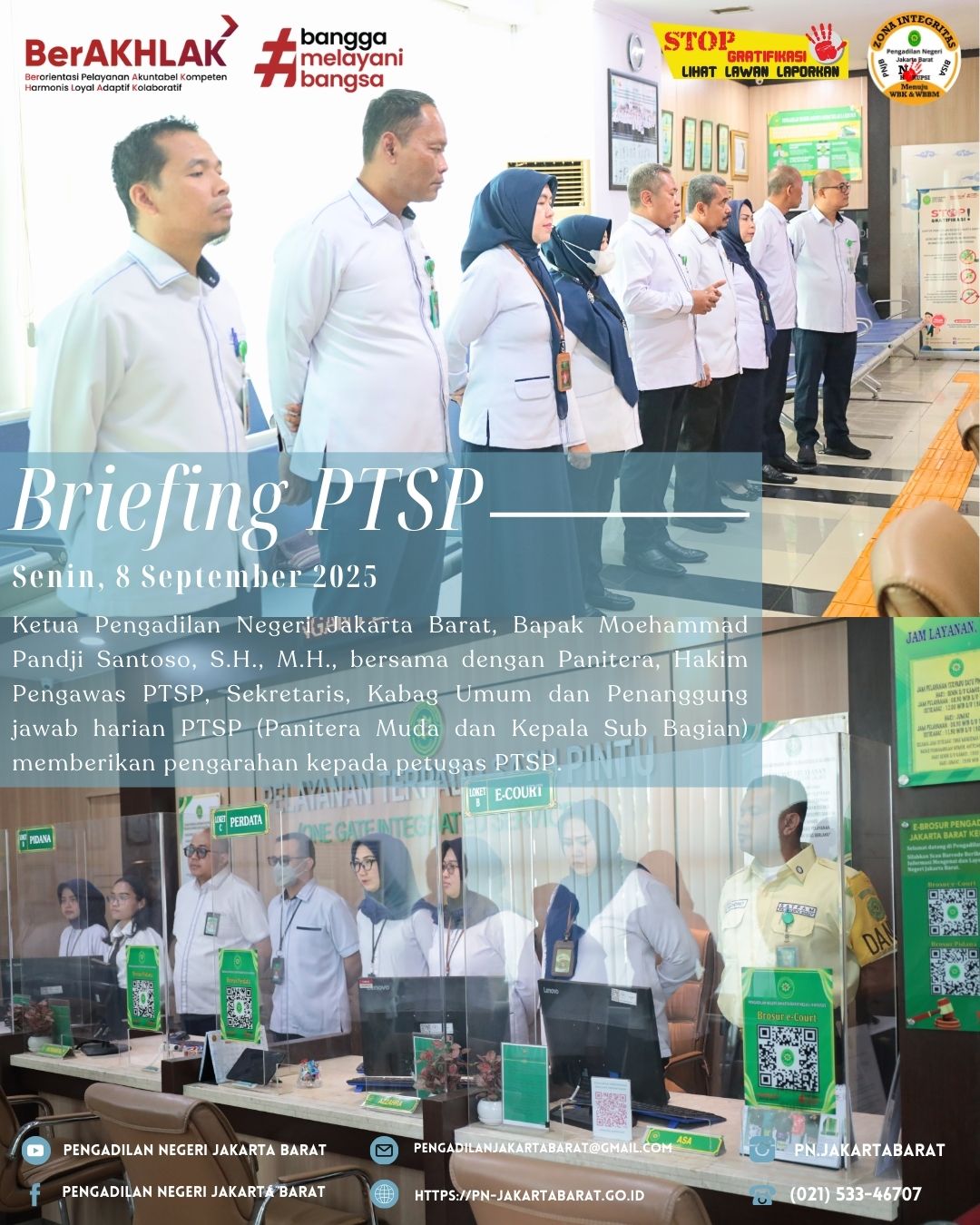 Briefing Pelayanan Terpadu Satu Pintu (PTSP) yang berlangsung di lobi PTSP Pengadilan Negeri Jakarta Barat dipimpin oleh Ketua Pengadilan Negeri Jakarta Barat, Bapak Moehammad Pandji Santoso, S.H., M.H., bersama Bapak Demi Hadiantoro, S.H., M.H. selaku Hakim Pengawas PTSP, Panitera dan Sekretaris selaku pengelola PTSP, dan para Panitera Muda dan Kepala Sub Bagian selaku penanggung jawab harian.
