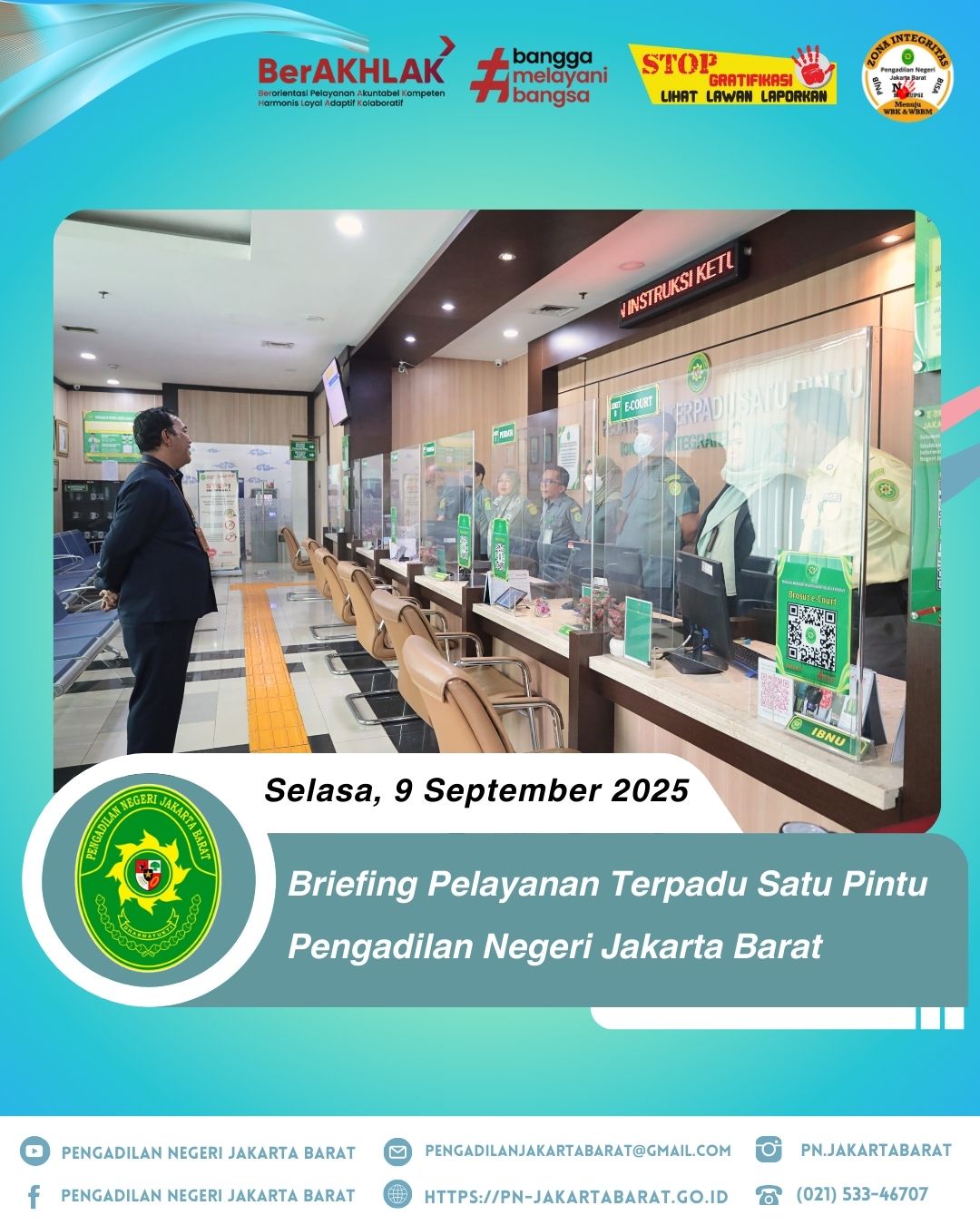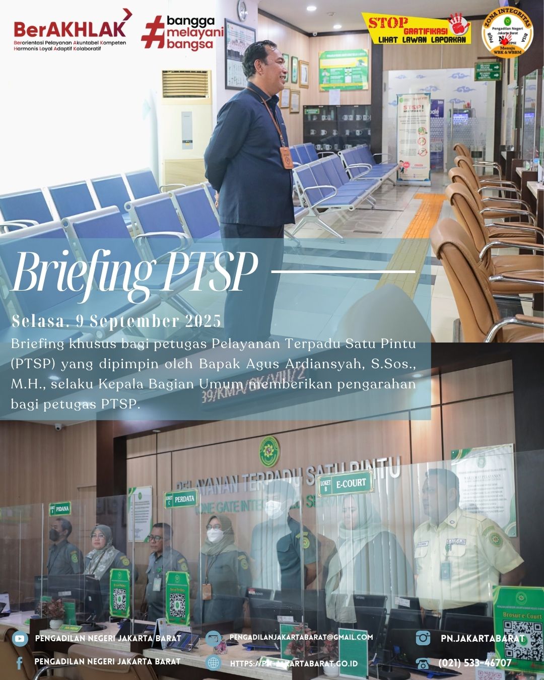 Bertempat di lobi PTSP Pengadilan Negeri Jakarta Barat, telah diadakan briefing khusus bagi petugas Pelayanan Terpadu Satu Pintu (PTSP) yang dipimpin oleh Bapak Agus Ardiansyah S.Sos., M.H., selaku Kepala Bagian Umum