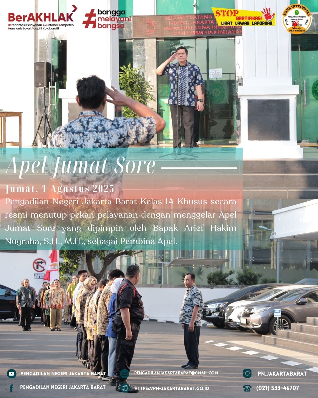 Dalam rangka mengakhiri kegiatan mingguan di Pengadilan Negeri Jakarta Barat Kelas IA Khusus, dilaksanakan Apel Jumat Sore yang dihadiri oleh seluruh Aparatur Peradilan. Apel ini dipimpin oleh Bapak Arief Hakim Nugraha, S.H., M.H., sebagai Pembina Apel, dan Bapak Agus Ardiansyah, S.Sos., M.H., sebagai Komandan Apel serta Ibu Marida, sebagai MC, serta Bapak Iqbal, S.E., sebagai pembaca 7 Nilai Utama Mahkamah Agung, Nilai-Nilai dasar ASN Ber-AKHLAK dan Yel-Yel.