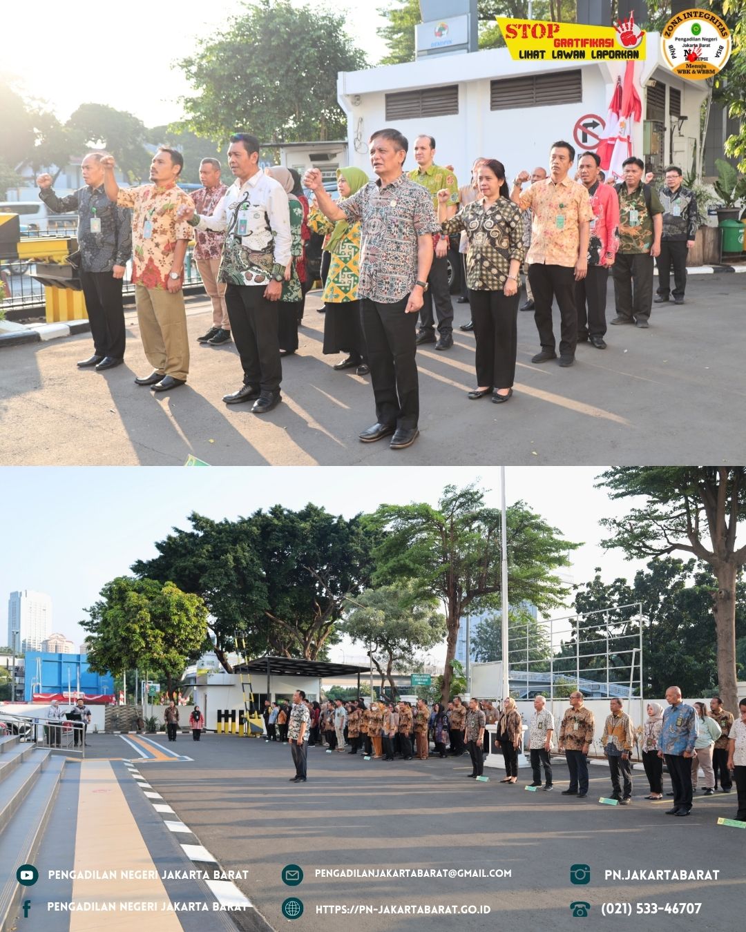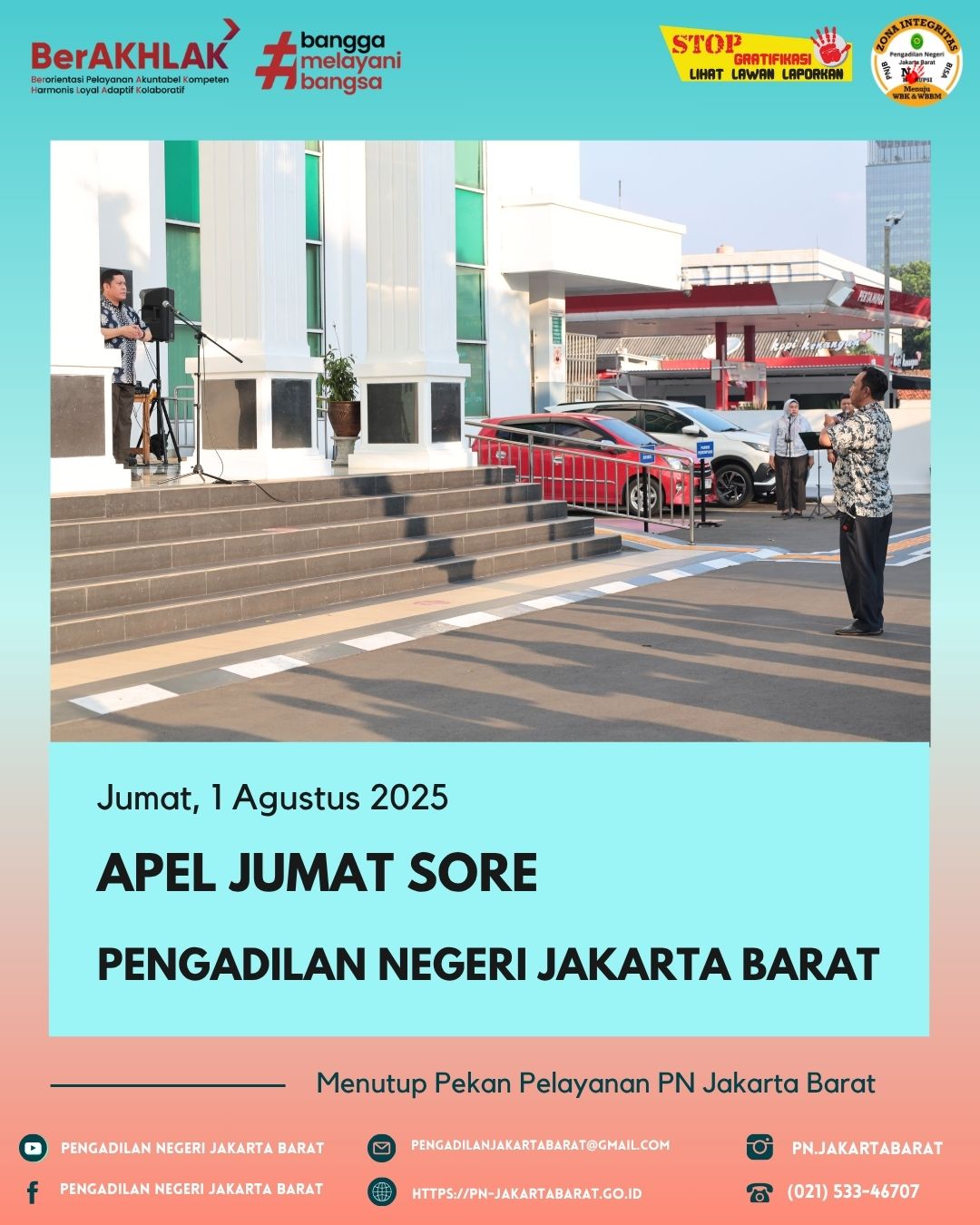Apel Jumat Sore ini diharapkan menjadi akhir yang baik untuk mengakhiri pekan pelayanan di Pengadilan Negeri Jakarta Barat Kelas IA Khusus. Semangat dan komitmen seluruh pegawai dalam menjalankan tugasnya diharapkan dapat terus mengukuhkan citra lembaga pengadilan yang profesional dan berkualitas.