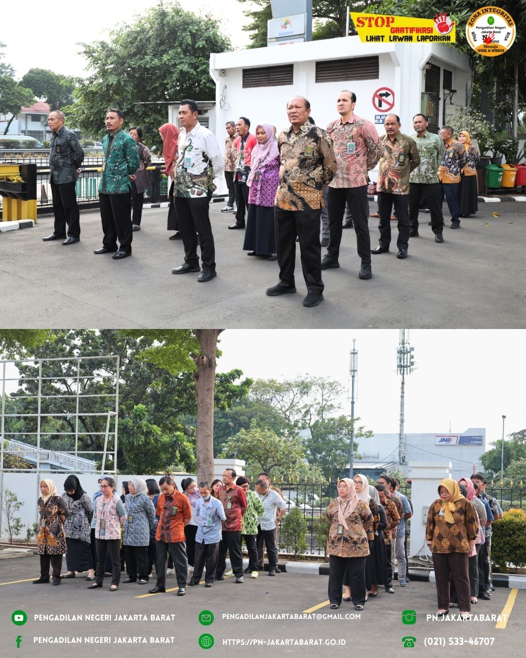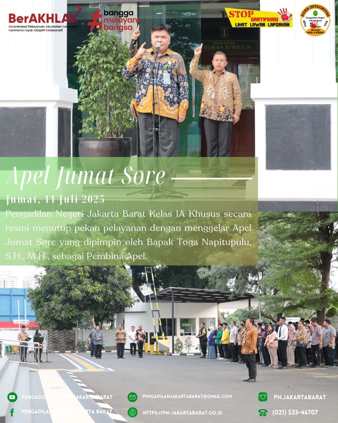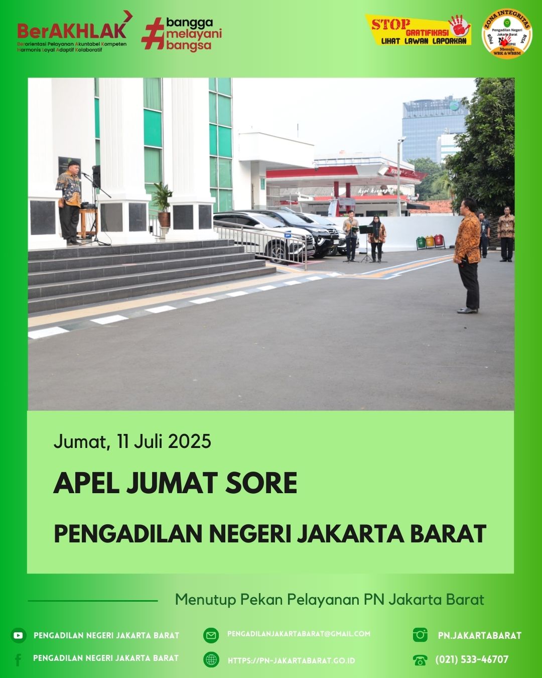 Apel Jumat Sore ini diharapkan menjadi akhir yang baik untuk mengakhiri pekan pelayanan di Pengadilan Negeri Jakarta Barat Kelas IA Khusus. Semangat dan komitmen seluruh pegawai dalam menjalankan tugasnya diharapkan dapat terus mengukuhkan citra lembaga pengadilan yang profesional dan berkualitas.