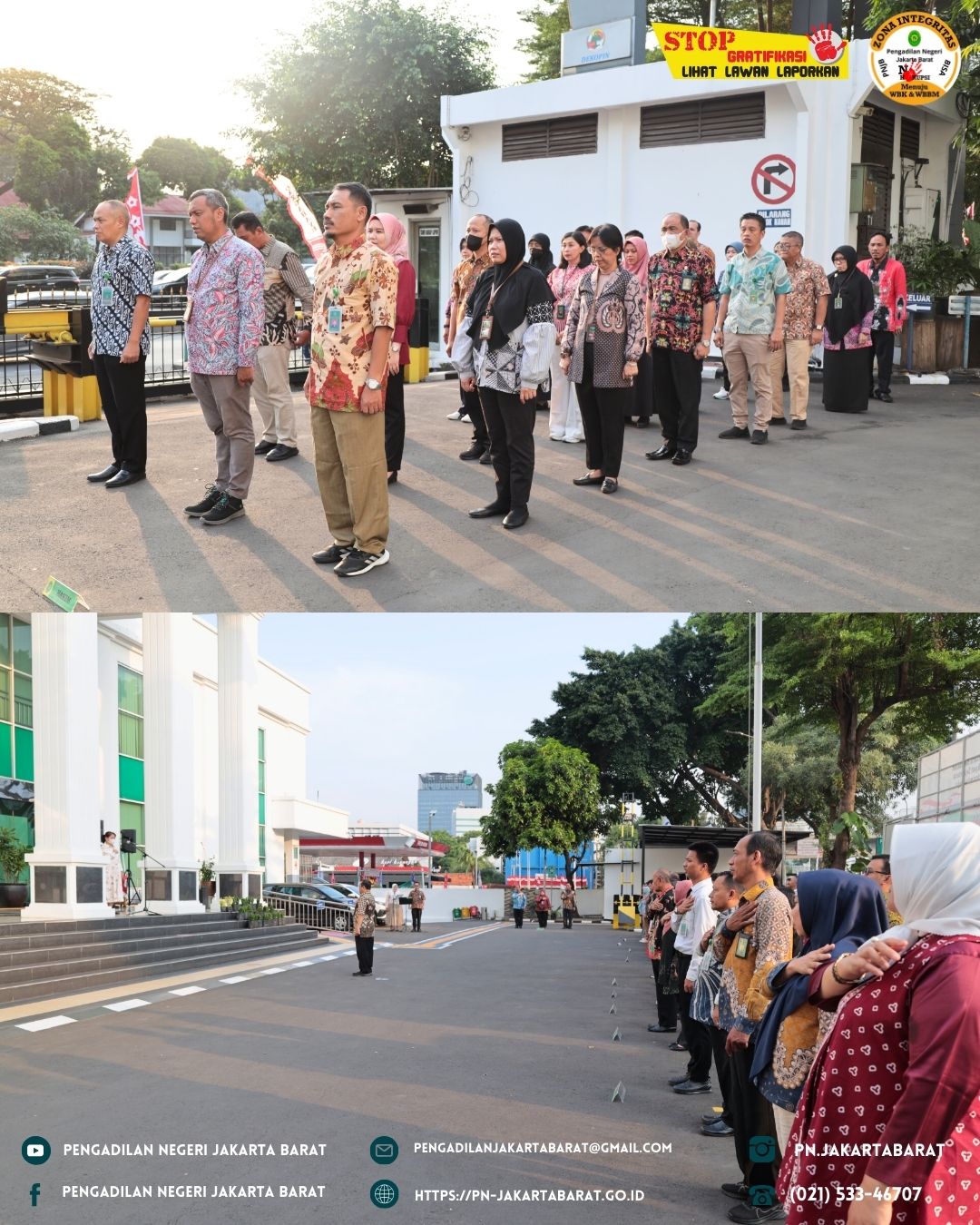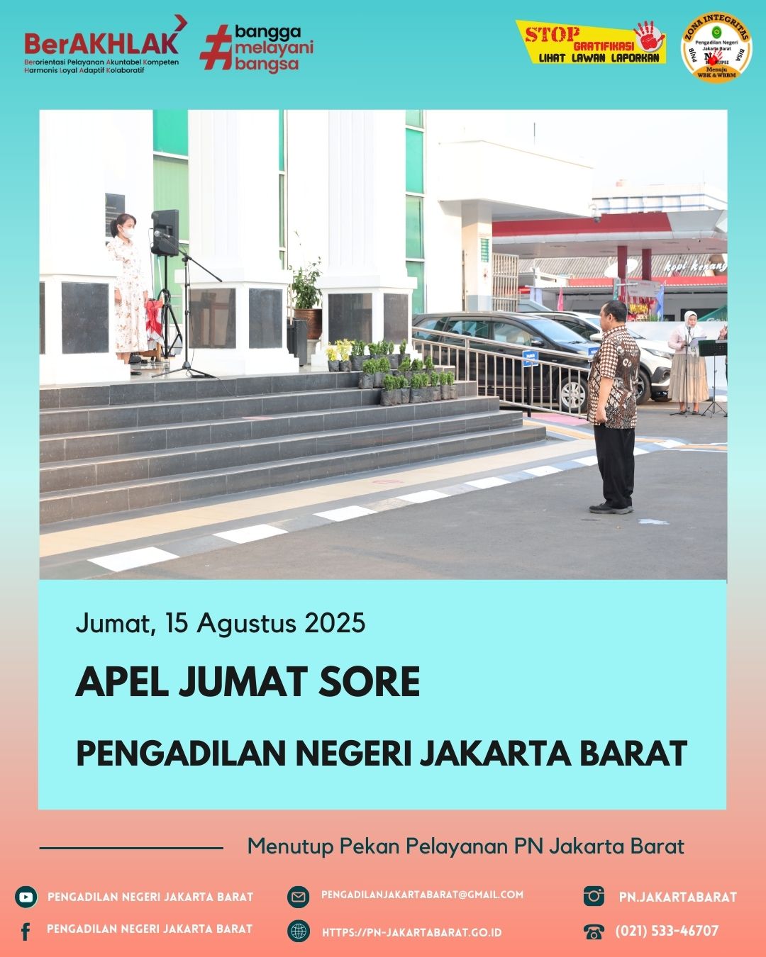 Dalam rangka mengakhiri kegiatan mingguan di Pengadilan Negeri Jakarta Barat Kelas IA Khusus, dilaksanakan Apel Jumat Sore yang dihadiri oleh seluruh Aparatur Peradilan. Apel ini dipimpin oleh Ibu Diah Tri Lestari, S.H., sebagai Pembina Apel, dan Bapak Muhammad Irwan Ardiansyah, S.Sos., sebagai Komandan Apel serta Ibu Marida, sebagai MC, serta Bapak Muhammad Rezeki, sebagai pembaca 7 Nilai Utama Mahkamah Agung, Nilai-Nilai dasar ASN Ber-AKHLAK dan Yel-Yel.