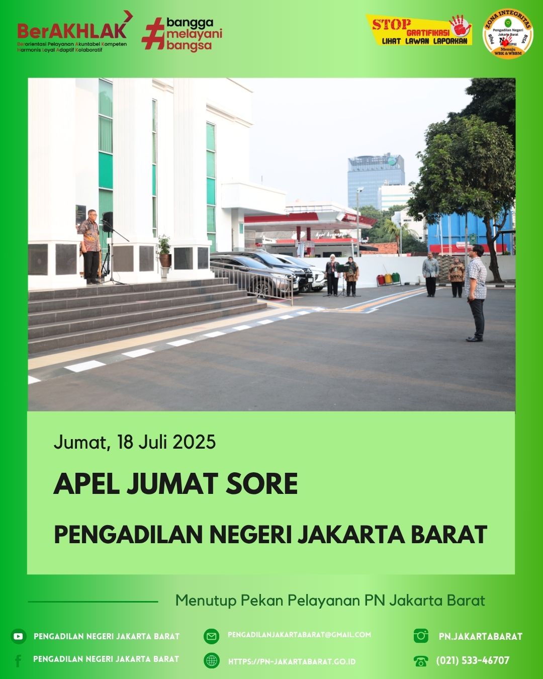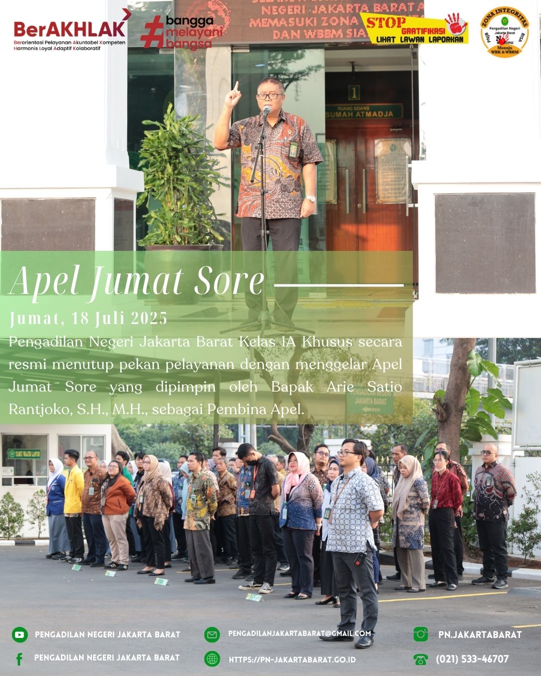 Dalam rangka mengakhiri kegiatan mingguan di Pengadilan Negeri Jakarta Barat Kelas IA Khusus, dilaksanakan Apel Jumat Sore yang dihadiri oleh seluruh Aparatur Peradilan.