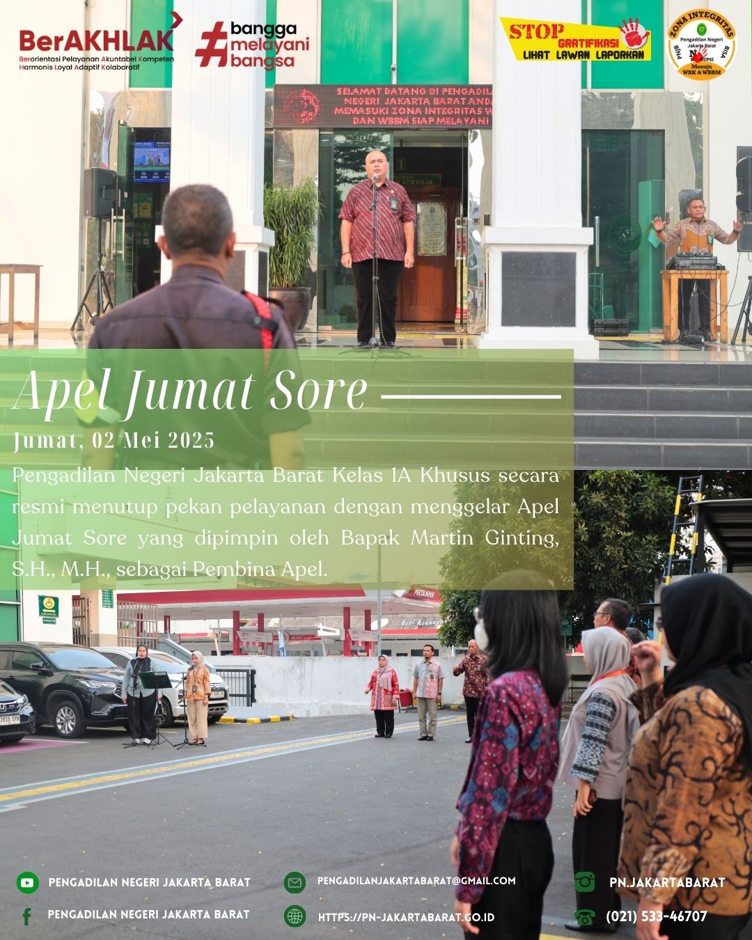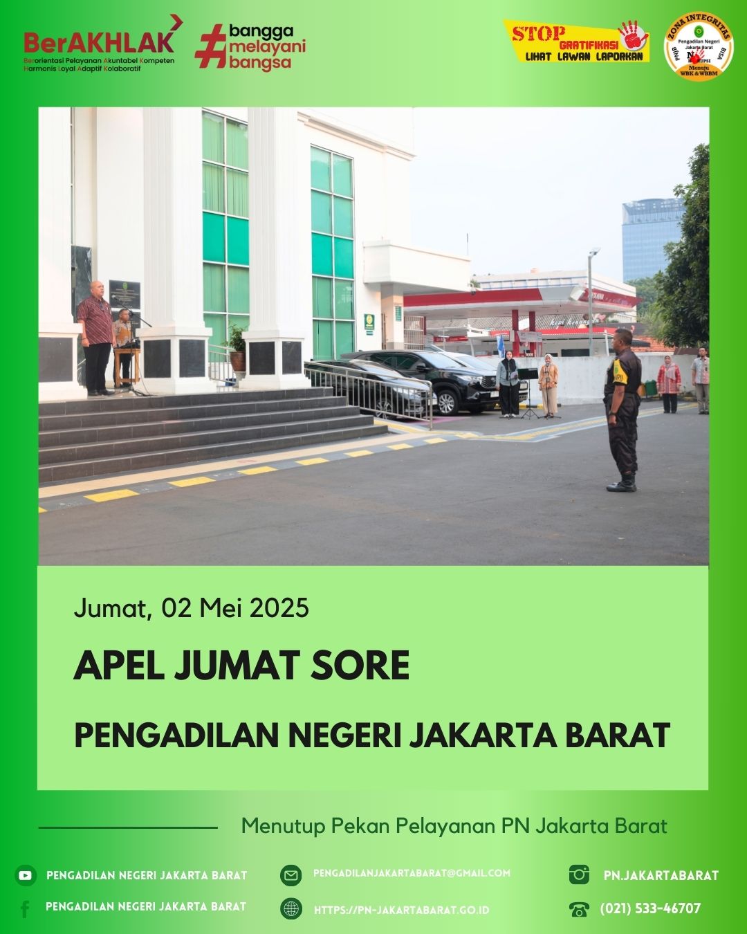 Apel Jumat Sore ini diharapkan menjadi akhir yang baik untuk mengakhiri pekan pelayanan di Pengadilan Negeri Jakarta Barat Kelas IA Khusus. Semangat dan komitmen seluruh pegawai dalam menjalankan tugasnya diharapkan dapat terus mengukuhkan citra lembaga pengadilan yang profesional dan berkualitas.