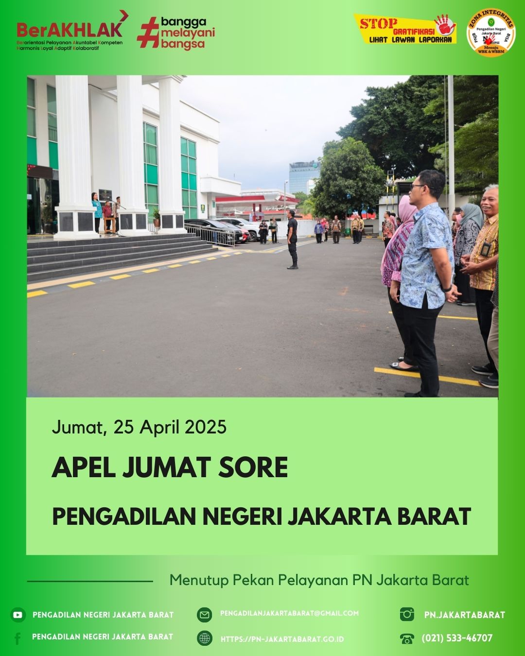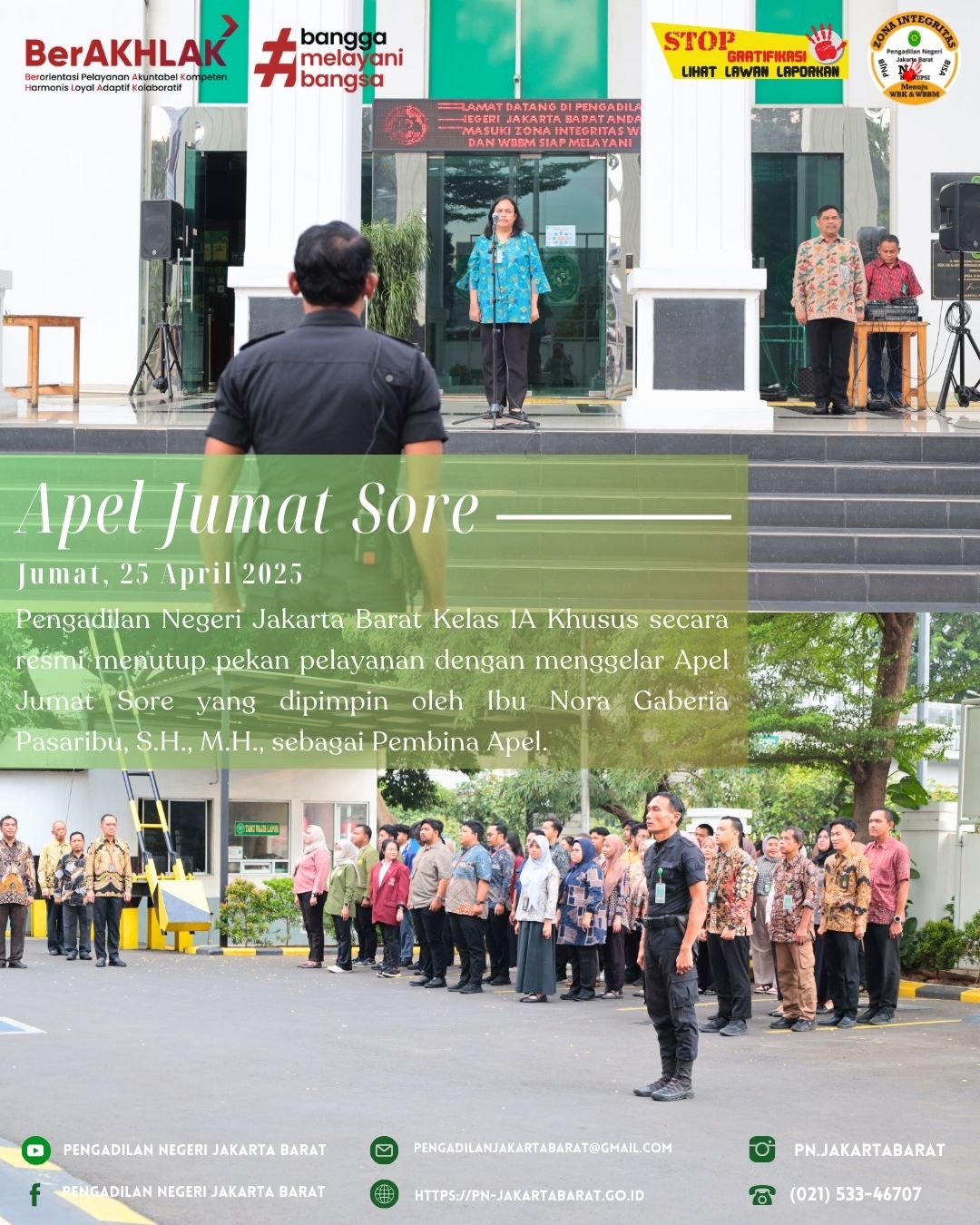 Apel Jumat Sore ini diharapkan menjadi akhir yang baik untuk mengakhiri pekan pelayanan di Pengadilan Negeri Jakarta Barat Kelas IA Khusus. Semangat dan komitmen seluruh pegawai dalam menjalankan tugasnya diharapkan dapat terus mengukuhkan citra lembaga pengadilan yang profesional dan berkualitas.