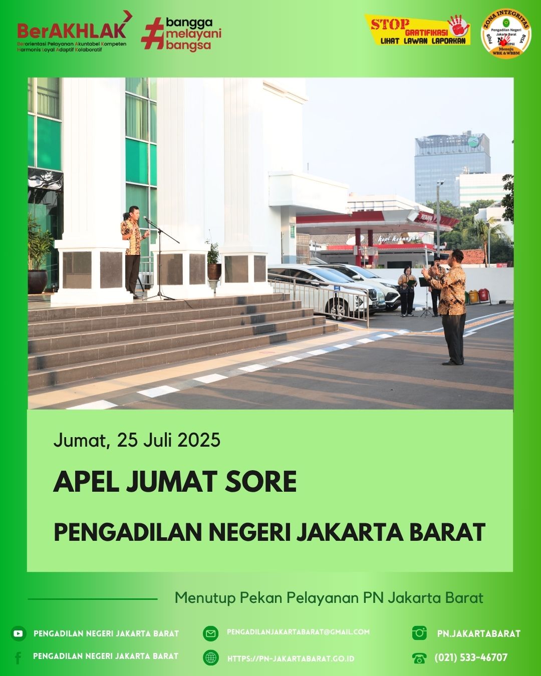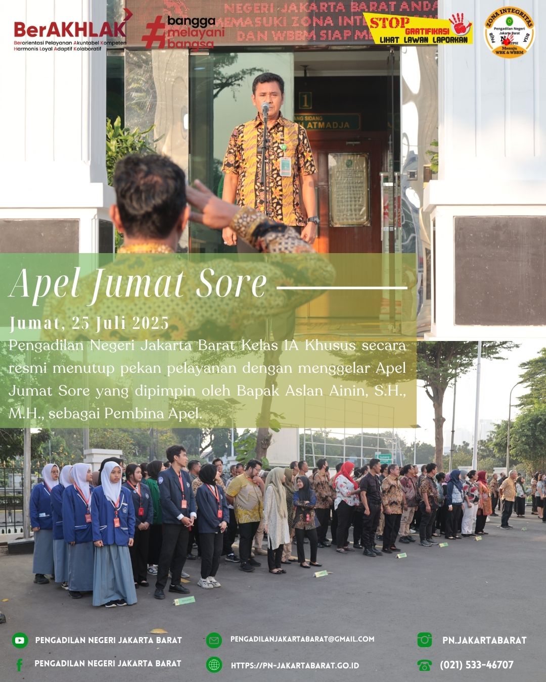 Dalam rangka mengakhiri kegiatan mingguan di Pengadilan Negeri Jakarta Barat Kelas IA Khusus, dilaksanakan Apel Jumat Sore yang dihadiri oleh seluruh Aparatur Peradilan.