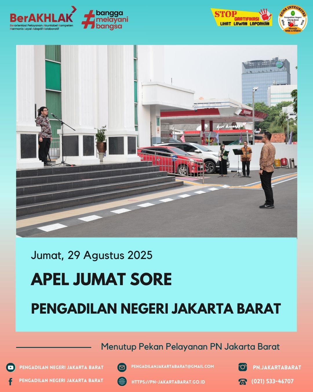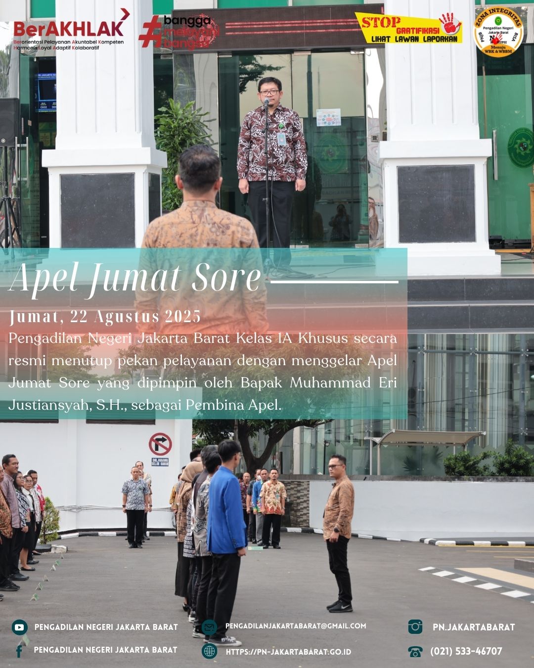 Dalam rangka mengakhiri kegiatan mingguan di Pengadilan Negeri Jakarta Barat Kelas IA Khusus, dilaksanakan Apel Jumat Sore yang dihadiri oleh seluruh Aparatur Peradilan. Apel ini dipimpin oleh Bapak Muhammad Eri Justiansyah, S.H., sebagai Pembina Apel, dan Bapak Sasongko Ika Haryadi, S.H., sebagai Komandan Apel serta Ibu Elfri Annisa Ivaramulya, S.Hum., sebagai MC, serta Bapak Ferry Hardani, A.Md., sebagai pembaca 7 Nilai Utama Mahkamah Agung, Nilai-Nilai dasar ASN Ber-AKHLAK dan Yel-Yel.