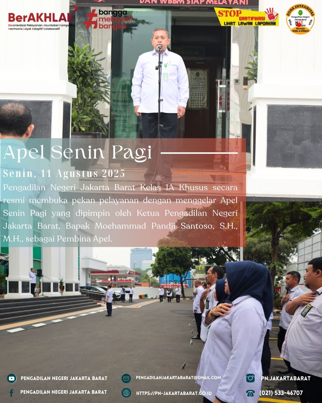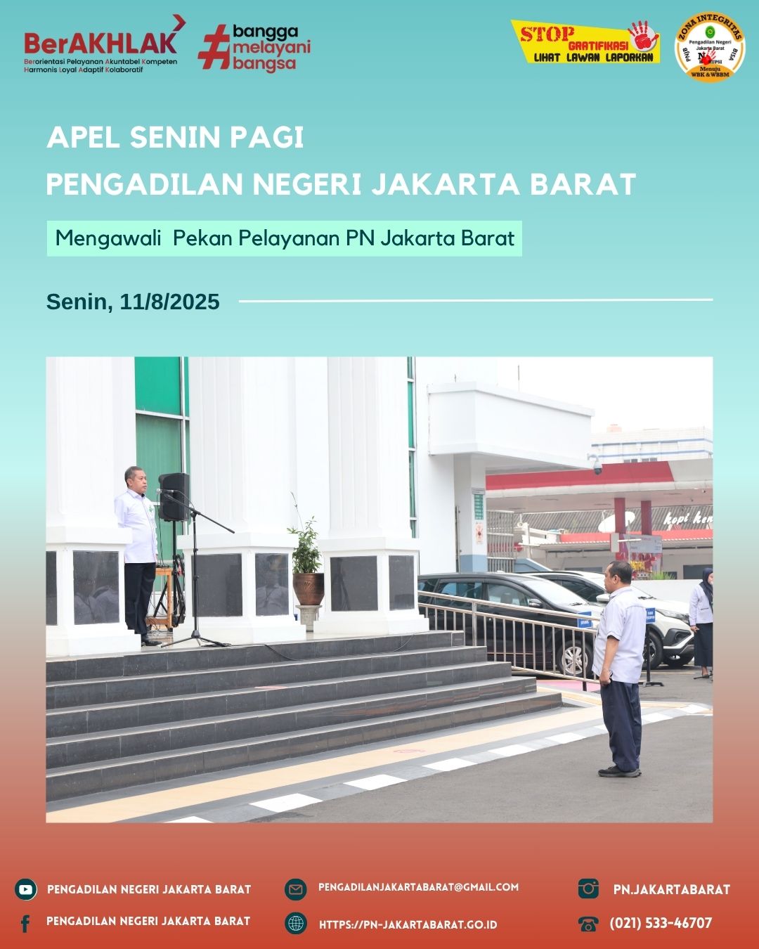 Apel Senin Pagi ini diharapkan menjadi awal yang baik untuk memulai pekan pelayanan di Pengadilan Negeri Jakarta Barat Kelas IA Khusus. Semangat dan komitmen seluruh pegawai dalam menjalankan tugasnya diharapkan dapat terus mengukuhkan citra lembaga pengadilan yang profesional dan berkualitas.