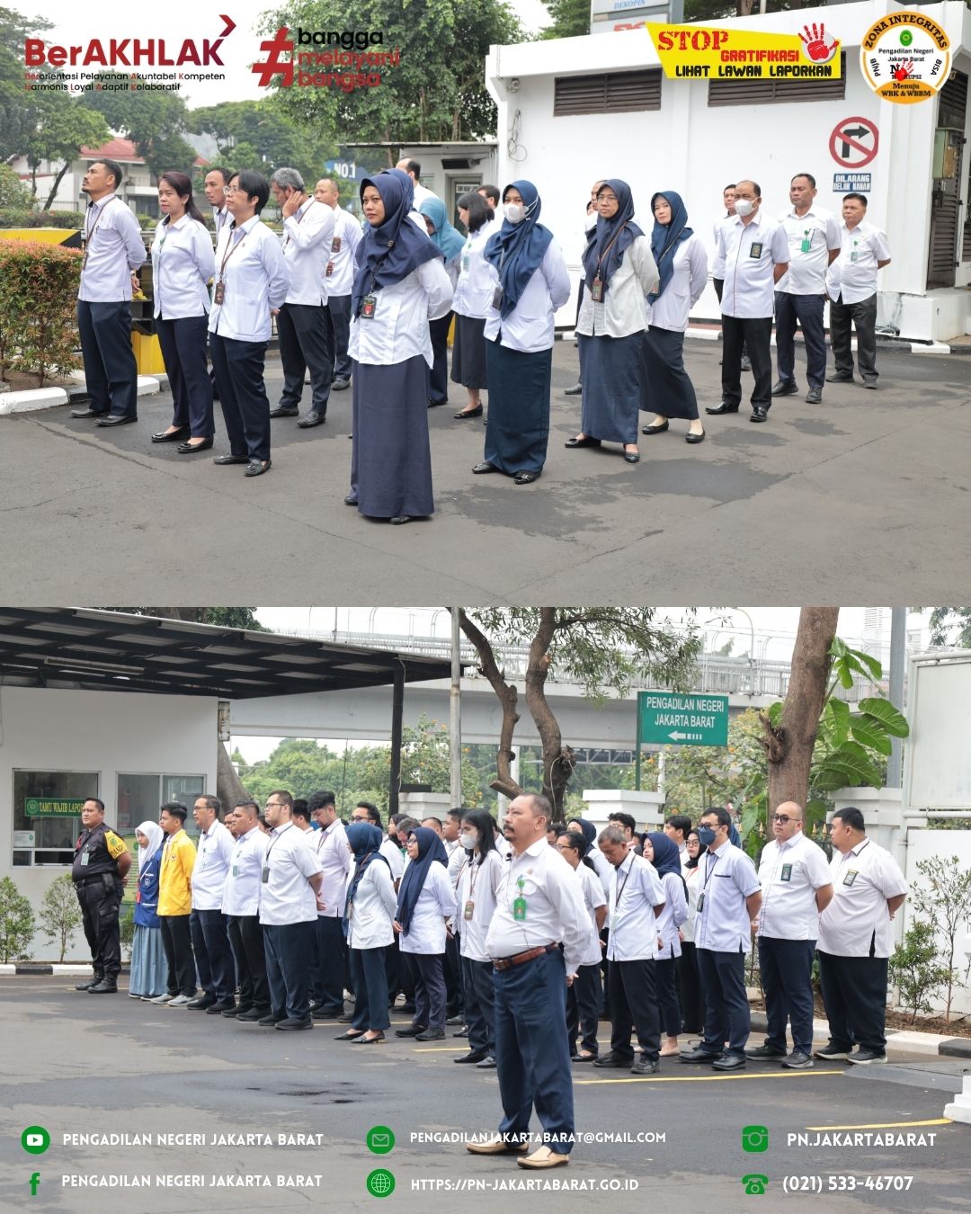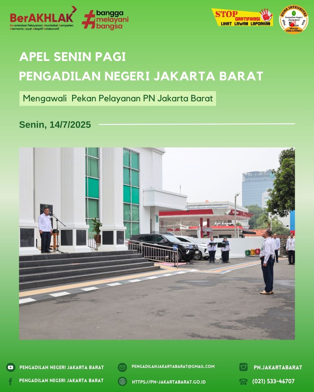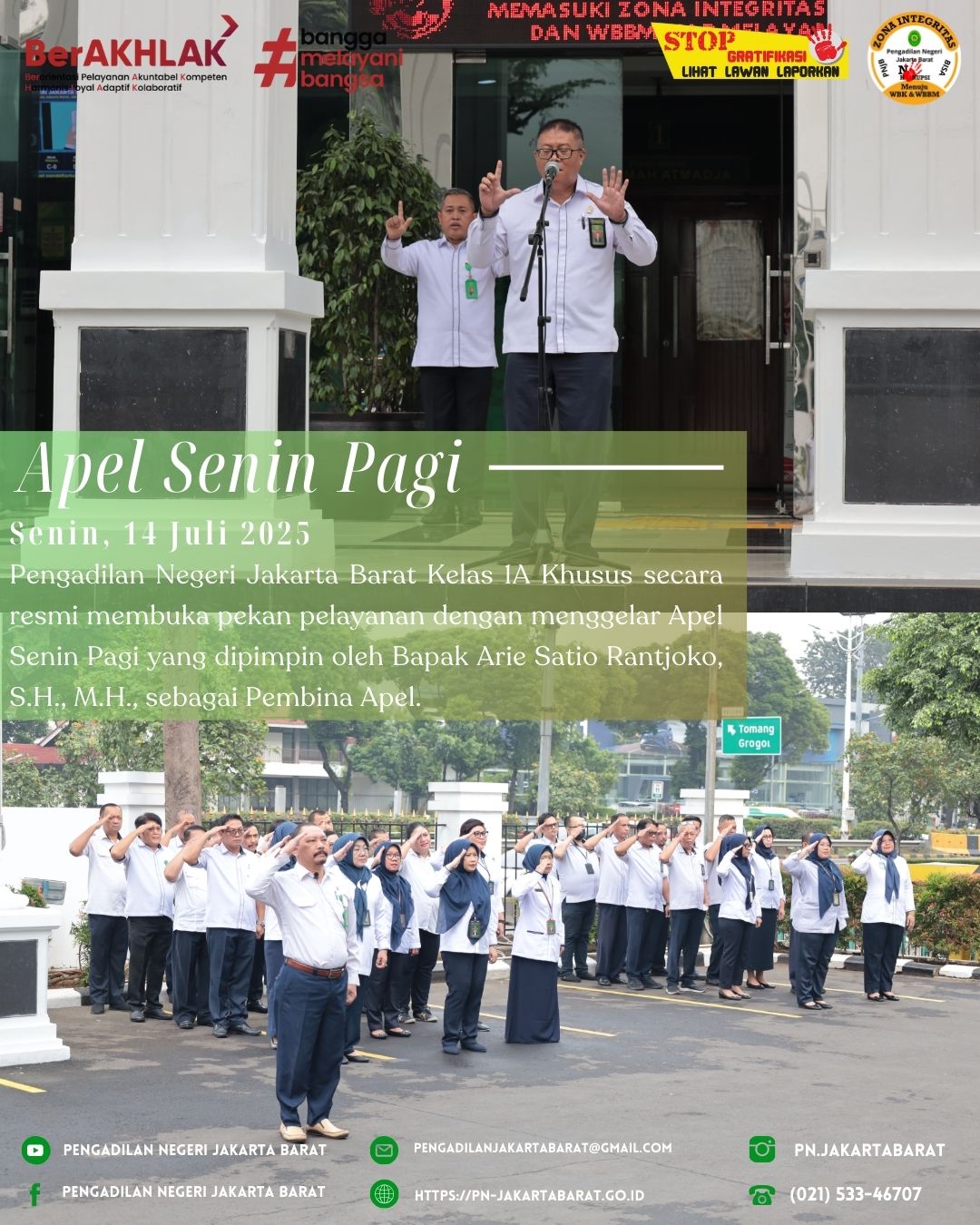Apel Senin Pagi ini diharapkan menjadi awal yang baik untuk memulai pekan pelayanan di Pengadilan Negeri Jakarta Barat Kelas IA Khusus. Semangat dan komitmen seluruh pegawai dalam menjalankan tugasnya diharapkan dapat terus mengukuhkan citra lembaga pengadilan yang profesional dan berkualitas.