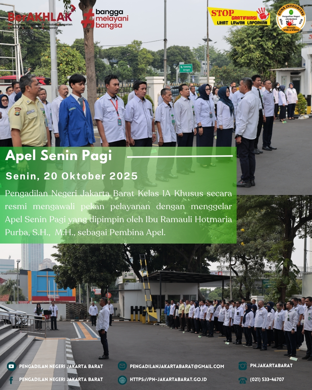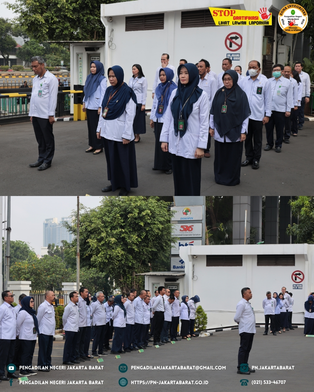 Hari ini mengawali kegiatan di Pengadilan Negeri Jakarta Barat Kelas IA Khusus, dibuka dengan Apel Senin Pagi yang dihadiri oleh seluruh Hakim dan Aparatur Peradilan.