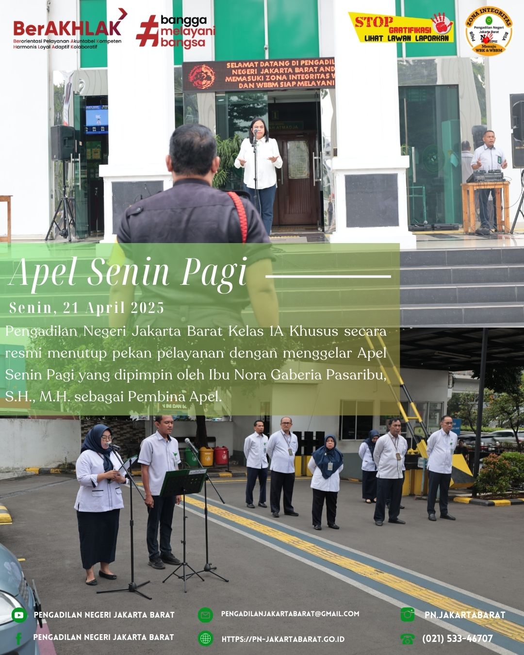 Apel Senin Pagi ini diharapkan menjadi awal yang baik untuk memulai pekan pelayanan di Pengadilan Negeri Jakarta Barat Kelas 1A Khusus. Semangat dan komitmen seluruh pegawai dalam menjalankan tugasnya diharapkan dapat terus mengukuhkan citra lembaga pengadilan yang profesional dan berkualitas.