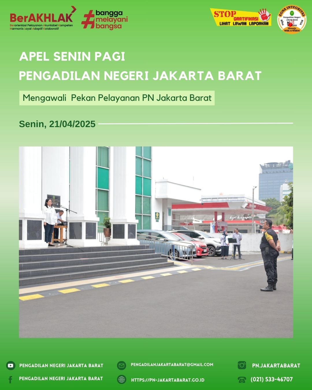 *PNJB, 21 April 2025* Hari ini mengawali kegiatan di Pengadilan Negeri Jakarta Barat Kelas 1A Khusus, dibuka dengan Apel Senin Pagi yang dihadiri oleh seluruh pegawai lembaga pengadilan.