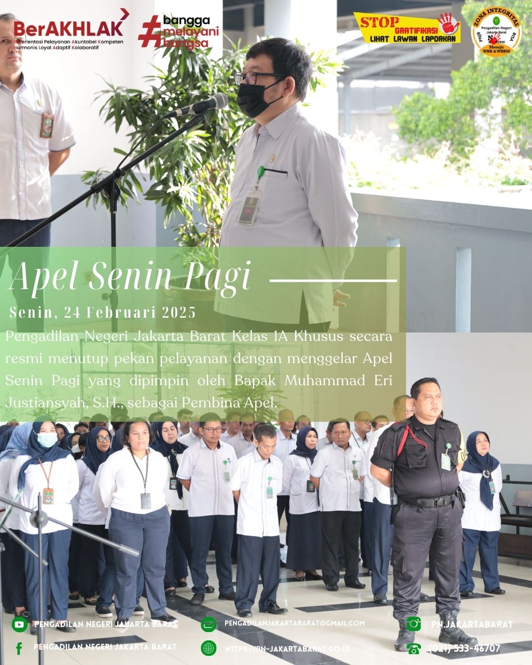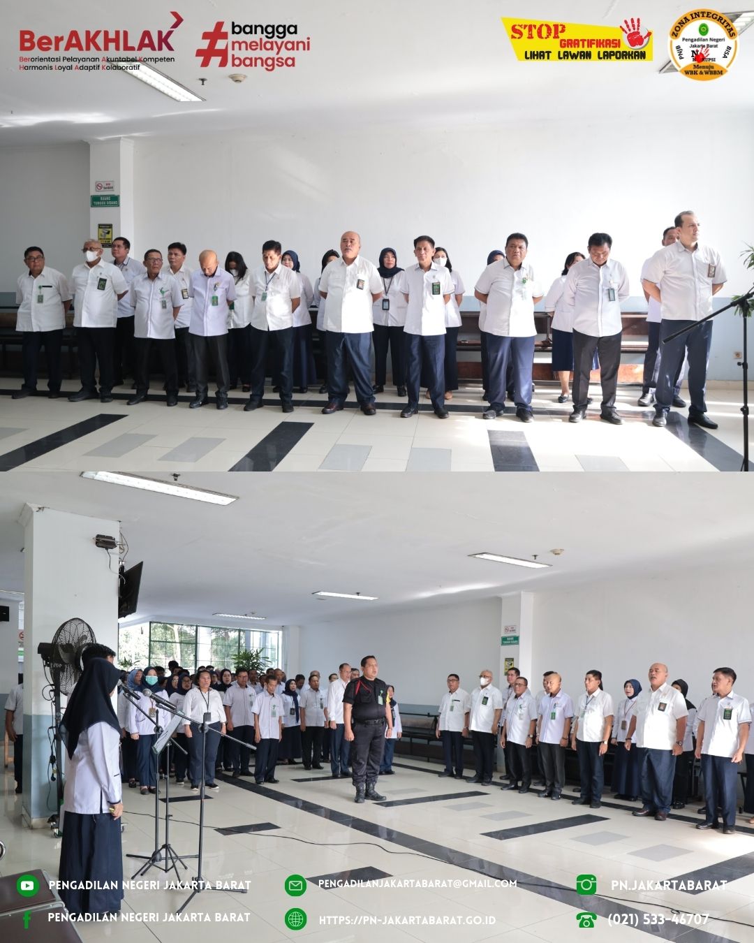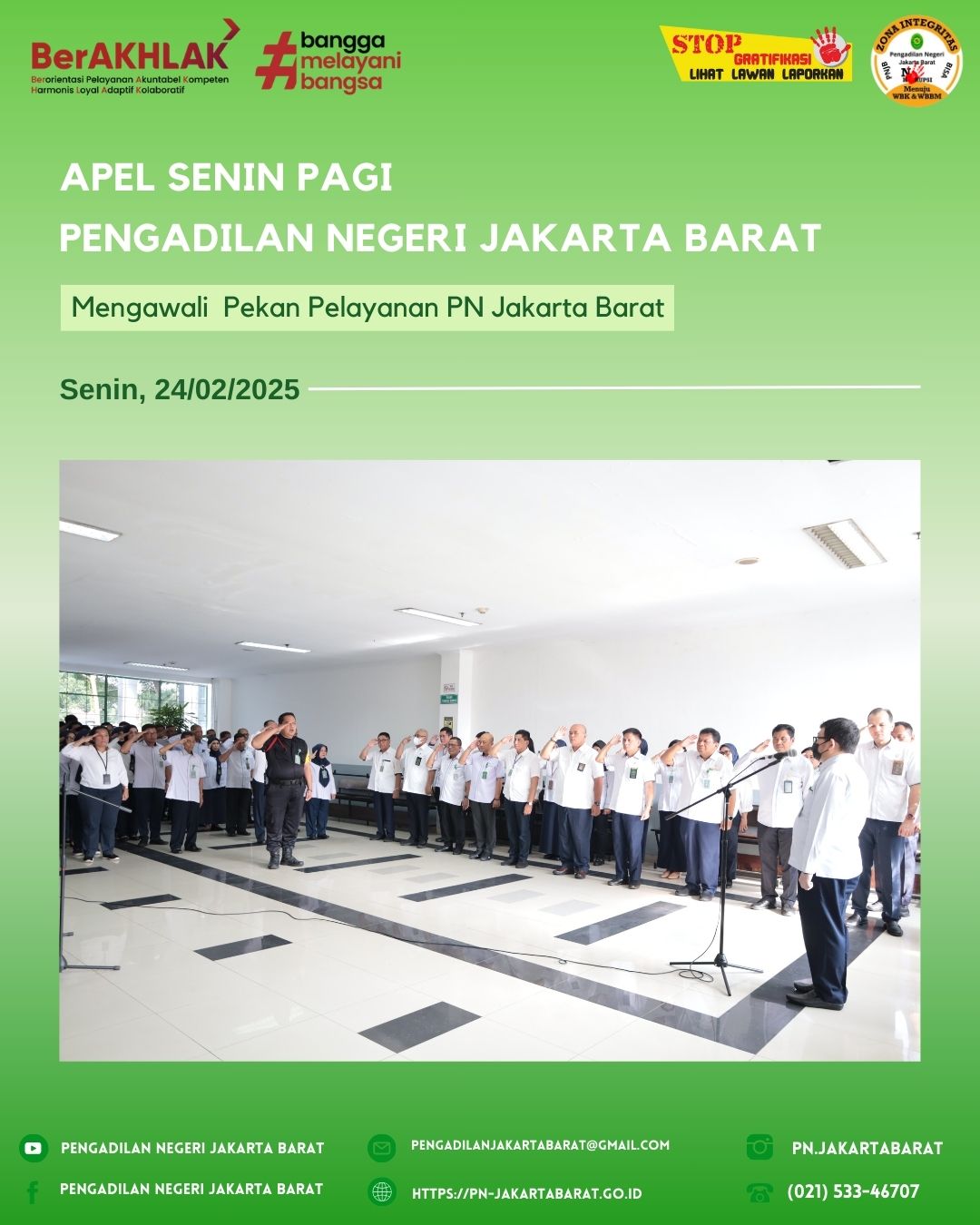Apel Senin Pagi ini diharapkan menjadi awal yang baik untuk memulai pekan pelayanan di Pengadilan Negeri Jakarta Barat Kelas 1A Khusus. Semangat dan komitmen seluruh pegawai dalam menjalankan tugasnya diharapkan dapat terus mengukuhkan citra lembaga pengadilan yang profesional dan berkualitas.