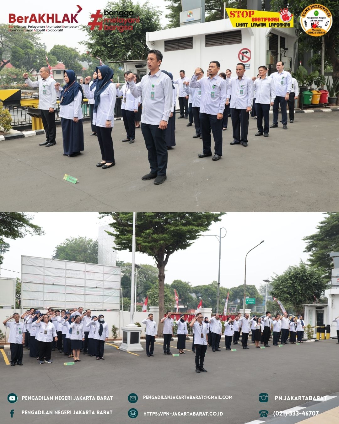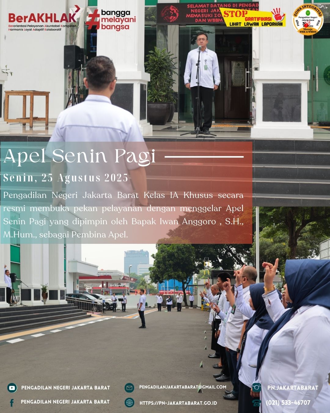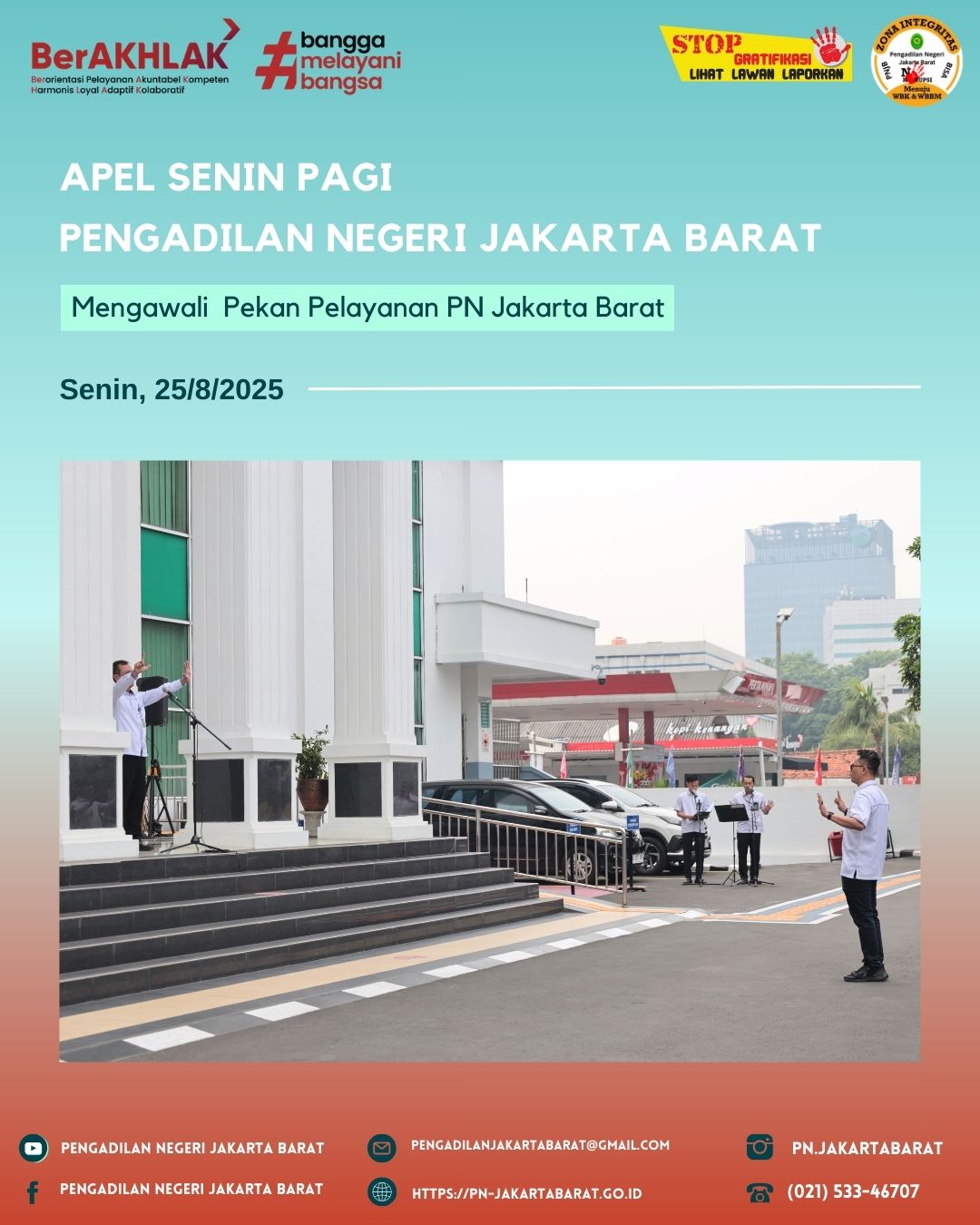 Apel Senin Pagi ini diharapkan menjadi awal yang baik untuk memulai pekan pelayanan di Pengadilan Negeri Jakarta Barat Kelas IA Khusus. Semangat dan komitmen seluruh pegawai dalam menjalankan tugasnya diharapkan dapat terus mengukuhkan citra lembaga pengadilan yang profesional dan berkualitas.