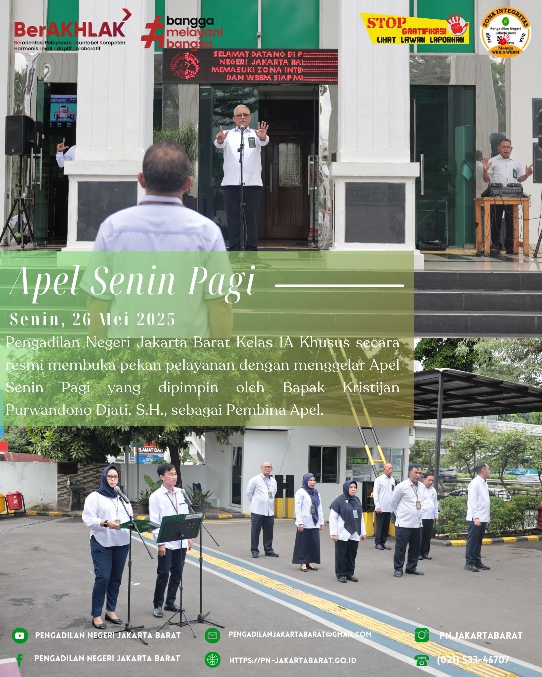 Apel Senin Pagi ini diharapkan menjadi awal yang baik untuk memulai pekan pelayanan di Pengadilan Negeri Jakarta Barat Kelas 1A Khusus. Semangat dan komitmen seluruh pegawai dalam menjalankan tugasnya diharapkan dapat terus mengukuhkan citra lembaga pengadilan yang profesional dan berkualitas.