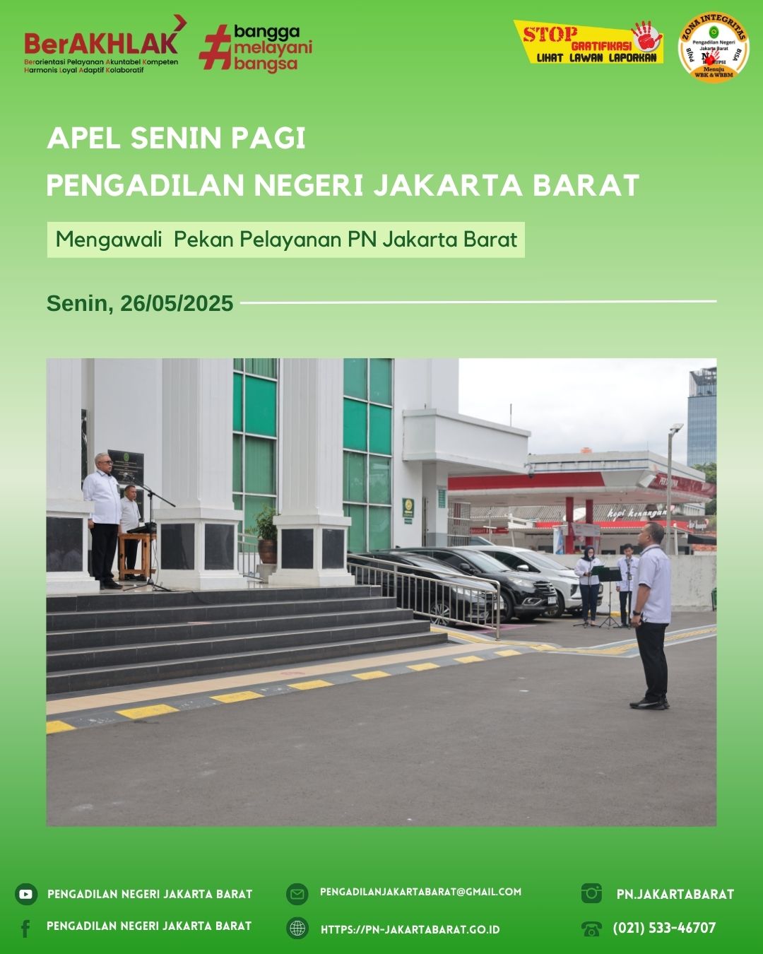 *PNJB, 26 Mei 2025* - Hari ini mengawali kegiatan di Pengadilan Negeri Jakarta Barat Kelas 1A Khusus, dibuka dengan Apel Senin Pagi yang dihadiri oleh seluruh pegawai lembaga pengadilan.