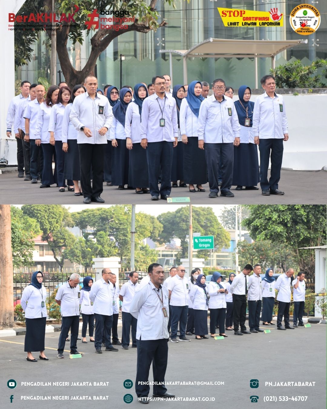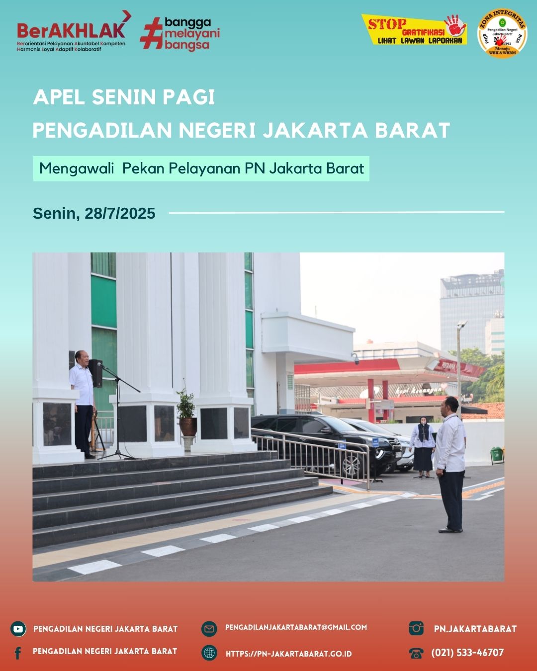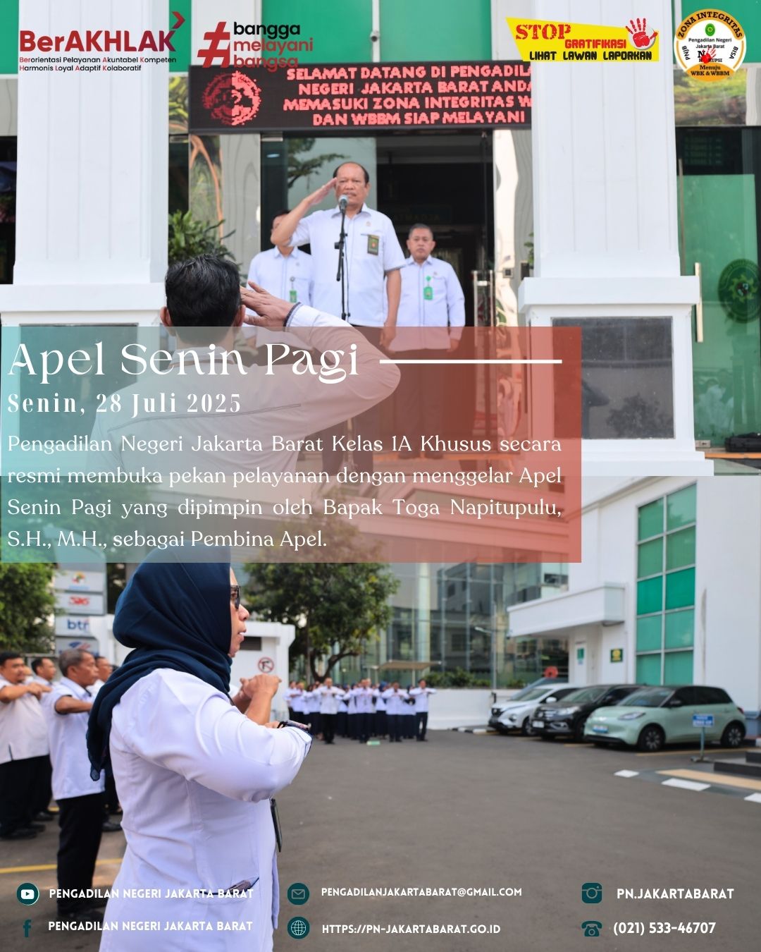 Hari ini mengawali kegiatan di Pengadilan Negeri Jakarta Barat Kelas IA Khusus, dibuka dengan Apel Senin Pagi yang dihadiri oleh seluruh pegawai lembaga pengadilan.