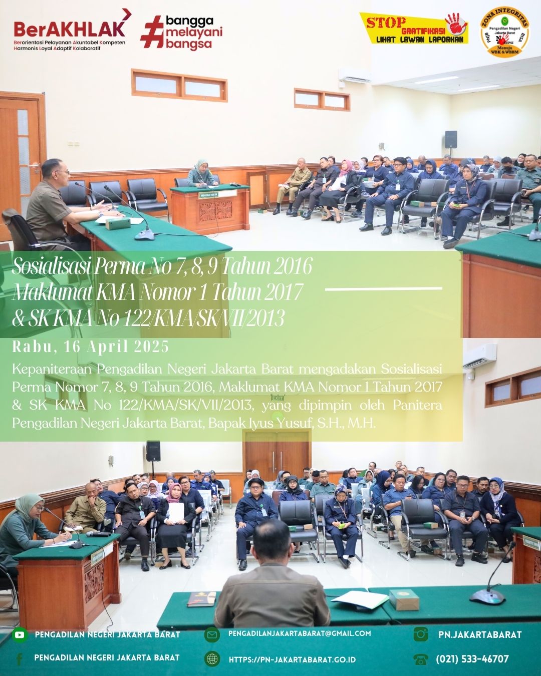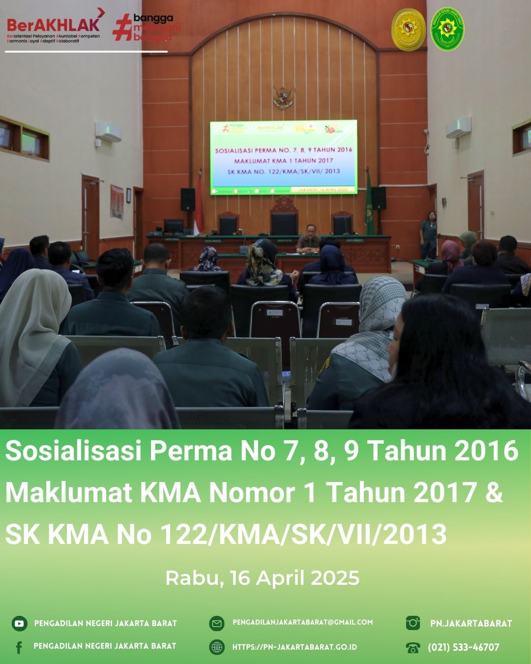 *PNJB, 16 April 2025* Kepaniteraan Pengadilan Negeri Jakarta Barat mengadakan Sosialisasi Perma Nomor 7, 8, 9 Tahun 2016, Maklumat KMA Nomor 1 Tahun 2017 dan SK KMA No 122/KMA/SK/VII/2013, yang dipimpin oleh Panitera Pengadilan Negeri Jakarta Barat, Bapak Iyus Yusuf, S.H., M.H.