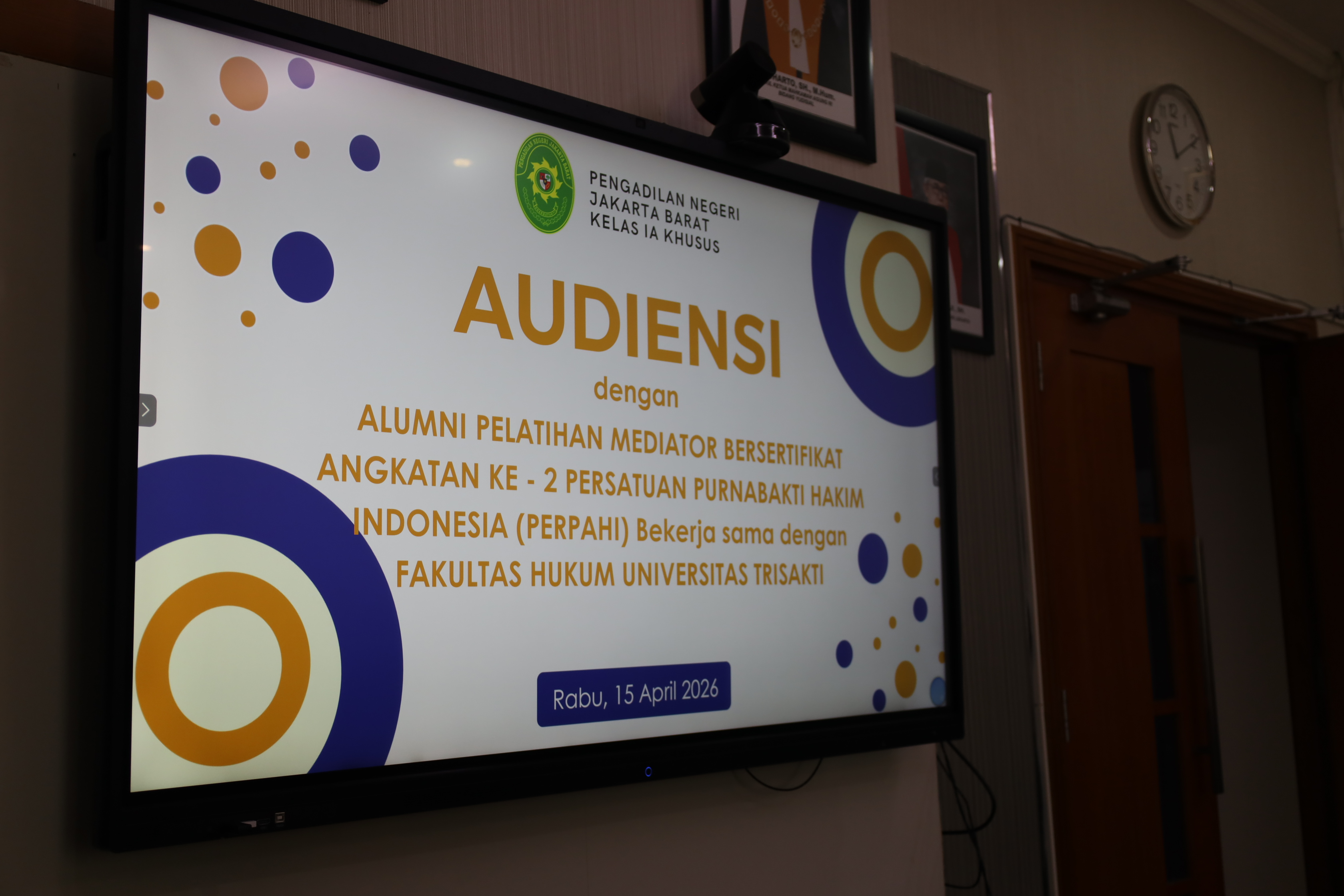 Jakarta - 15 April 2026, Bertempat di Ruang Media Center Pengadilan Negeri Jakarta Barat Kelas IA Khusus dilaksanakan Acara Audiensi Alumni Pelatihan Mediator Bersertifikat Angkatan ke 2 Persatuan Purnabakti Hakim Indonesia (PERPAHI) Bekerjasama dengan Fakultas Hukum Universitas Trisakti yang dihadiri oleh Ketua Pengadilan Negeri Jakarta Barat Kelas IA Khusus Bpk. MOEHAMMAD PANDJI SANTOSO S.H., M.H., Wakil Ketua Pengadilan Negeri Jakarta Barat Kelas IA Khusus Bpk. MATEUS SUKUSNO AJI, S.H., M.Hum., Panitera, Panitera Muda Perdata dan Panitera Muda Hukum Pengadilan Negeri Jakarta Barat Kelas IA Khusus.