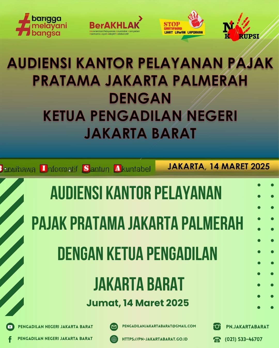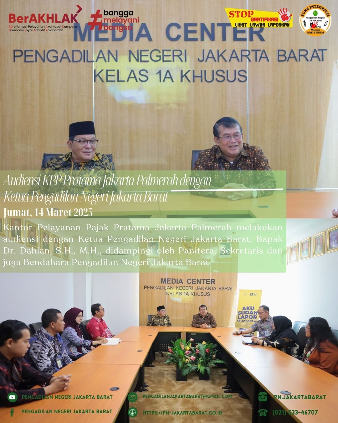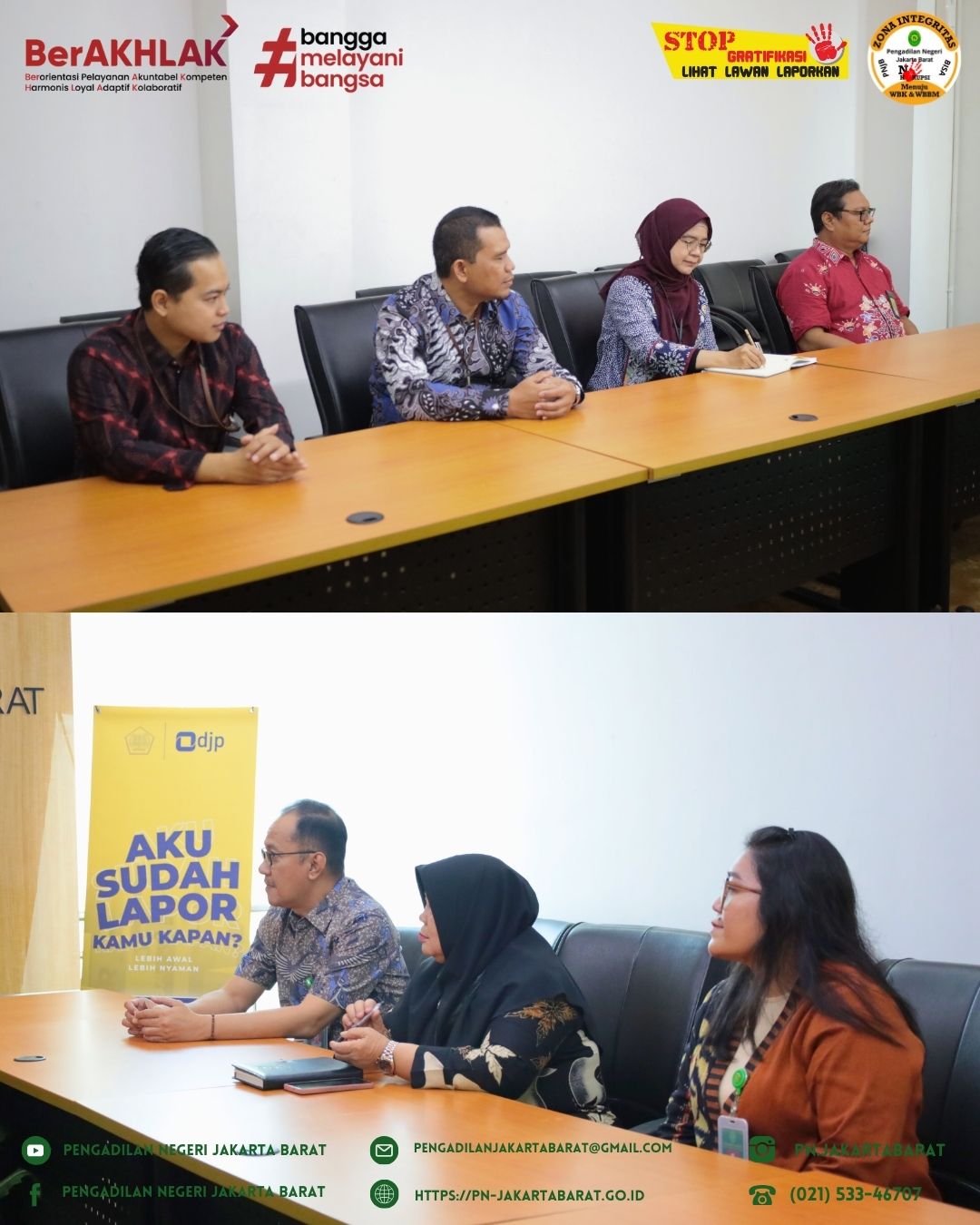 *PNJB, 14 Maret 2025* Kantor Pelayanan Pajak Pratama Jakarta Palmerah melakukan audiensi dengan Ketua Pengadilan Negeri Jakarta Barat, Bapak Dr. Dahlan, S.H., M.H., didampingi oleh Panitera, Sekretaris dan juga Bendahara Pengadilan Negeri Jakarta Barat.