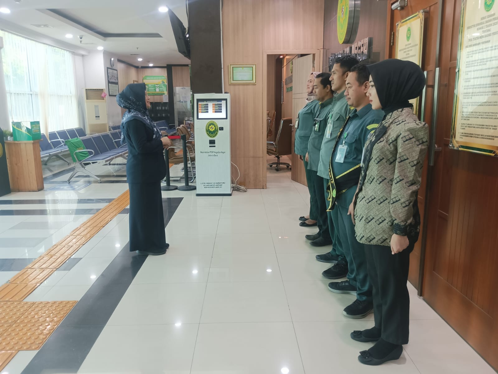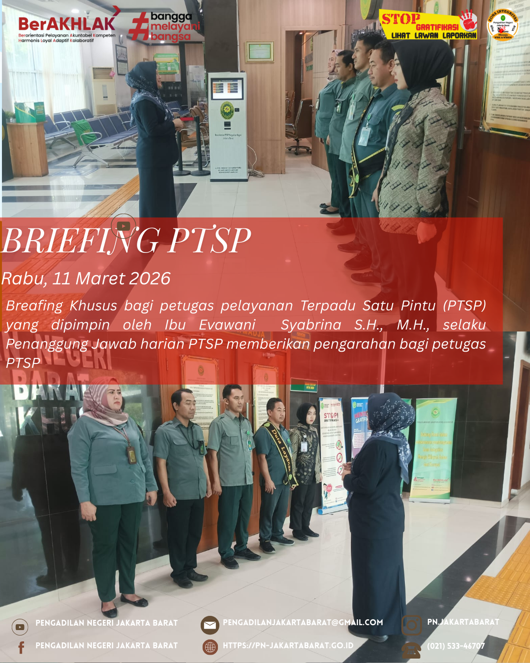 Jakarta, 11 Maret 2026 - Briefing Pelayanan Terpadu Satu Pintu (PTSP) yang berlangsung di lobi Pengadilan Negeri Jakarta Barat Kelas IA Khusus dipimpin oleh Ibu Evawani Syabrina S.H., M.H.,selaku Kepala Sub Bagian Tata Usaha dan Keuangan dan Penanggung jawab harian PTSP. Dalam briefingnya beliau menyampaikan arahan dan panduan kepada petugas PTSP agar selalu dapat meningkatkan pelayanan kepada masyarakat dengan menekankan pentingnya kecepatan, ketepatan, dan keakuratan dalam penanganan setiap permohonan yang masuk ke PTSP.