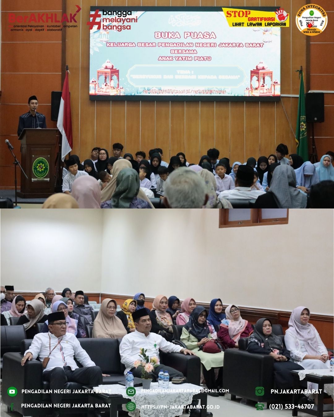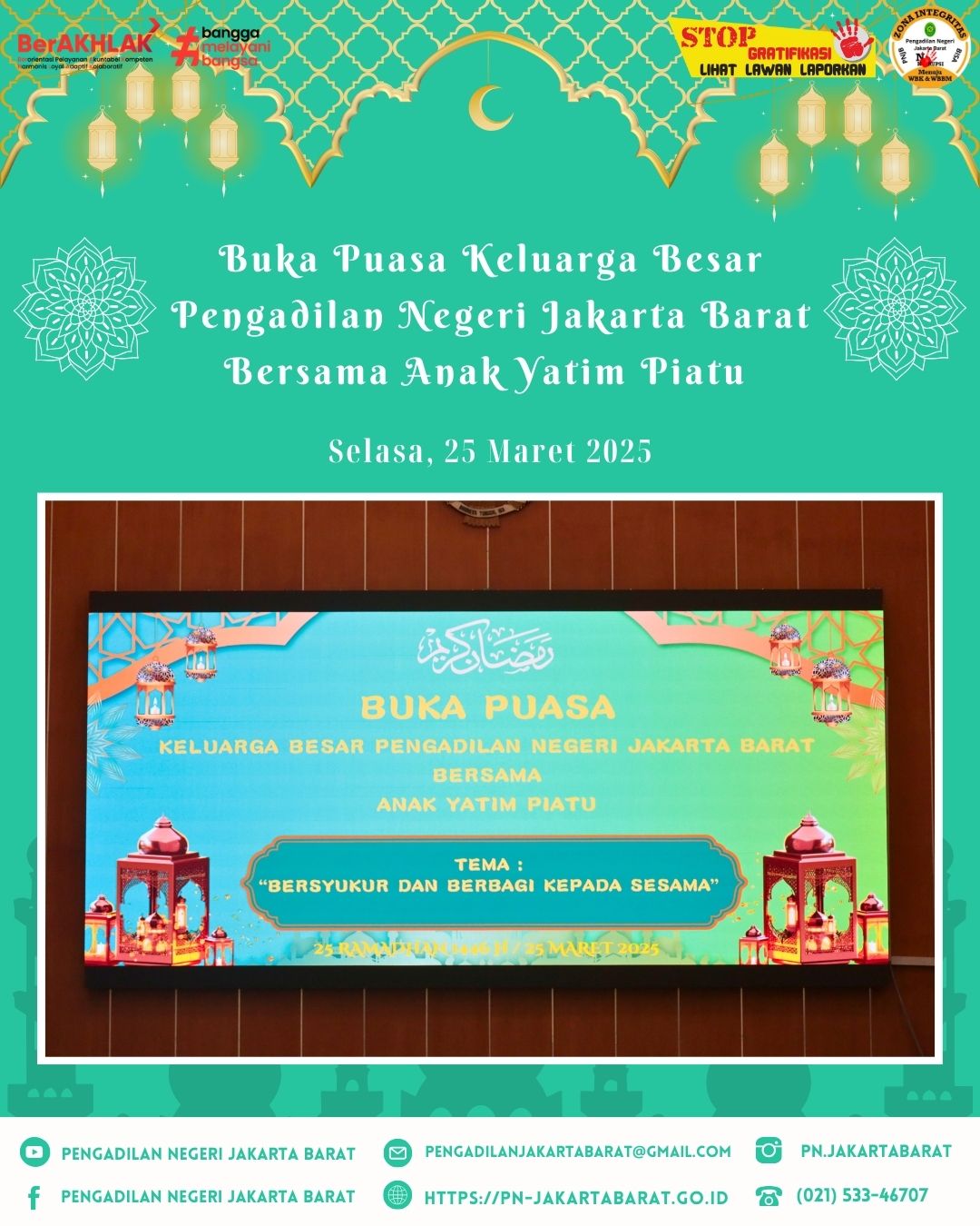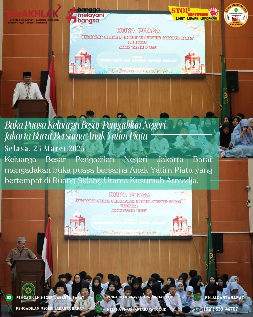 *PNJB, 25 Maret 2025* - Keluarga Besar Pengadilan Negeri Jakarta Barat Kelas IA Khusus mengadakan buka puasa bersama Anak Yatim Piatu sebagai bentuk syukur atas pertambahan usia Ketua Pengadilan Negeri Jakarta Barat Kelas IA Khusus, Bapak Dr. Dahlan, S.H., M.H.
