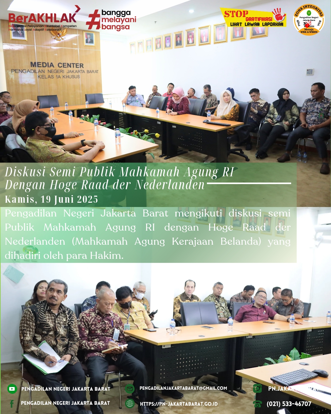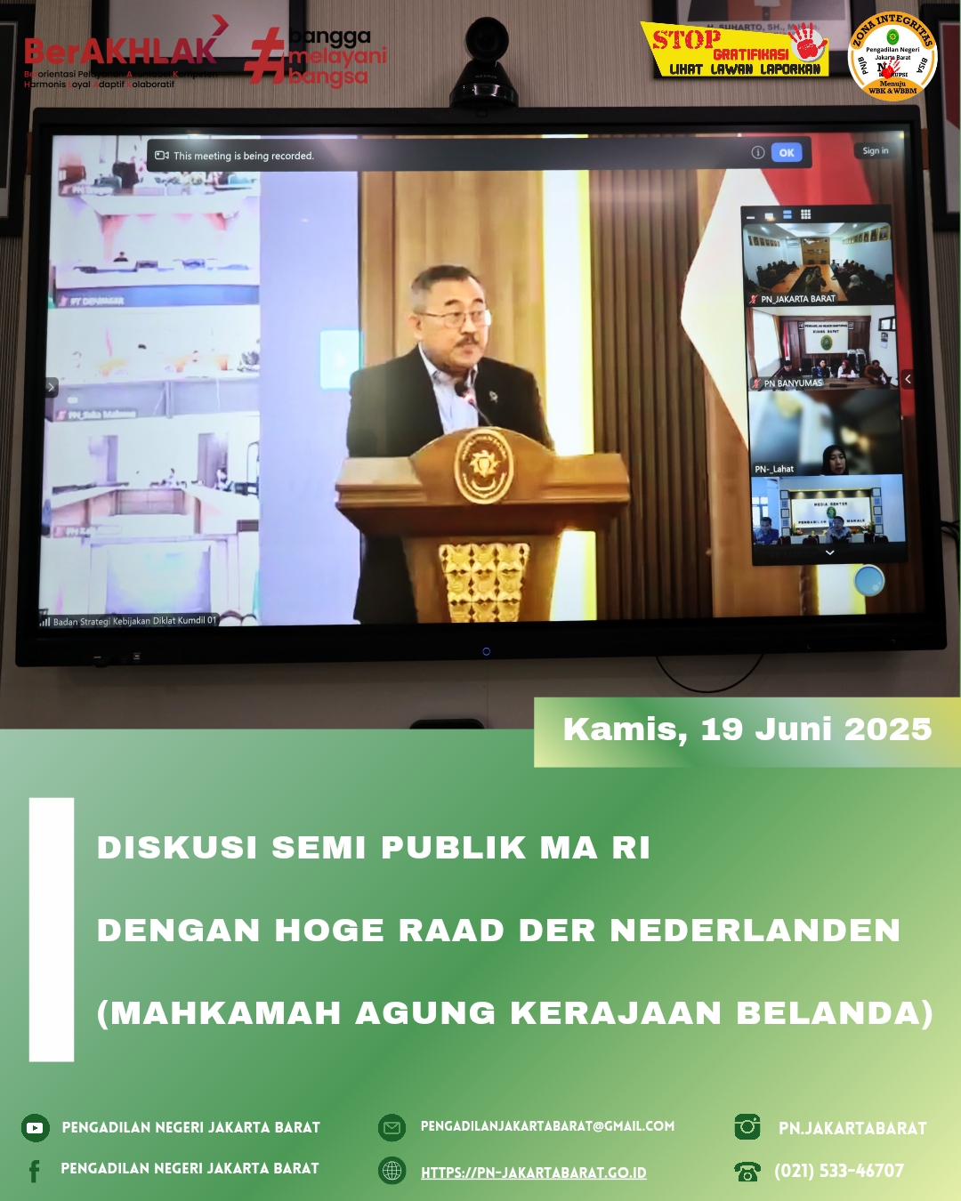 *PNJB, 19 Juni 2025* - Pengadilan Negeri Jakarta Barat mengikuti diskusi semi Publik Mahkamah Agung RI dengan Hoge Raad der Nederlanden (Mahkamah Agung Kerajaan Belanda) yang dihadiri oleh para Hakim.