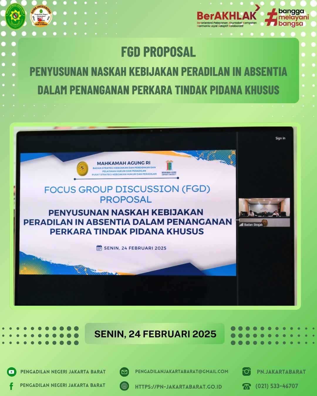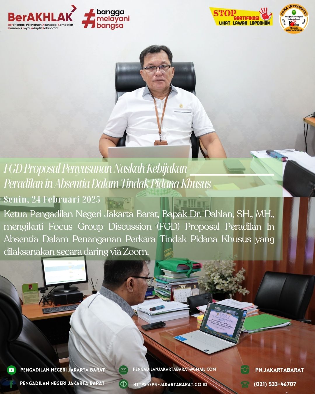 *PNJB, 24 Februari 2025* - Ketua Pengadilan Negeri Jakarta Barat, Bapak Dr. Dahlan, SH., MH., mengikuti Focus Group Discussion (FGD) Proposal Peradilan In Absentia Dalam Penanganan Perkara Tindak Pidana Khusus yang dilaksanakan secara daring via Zoom.