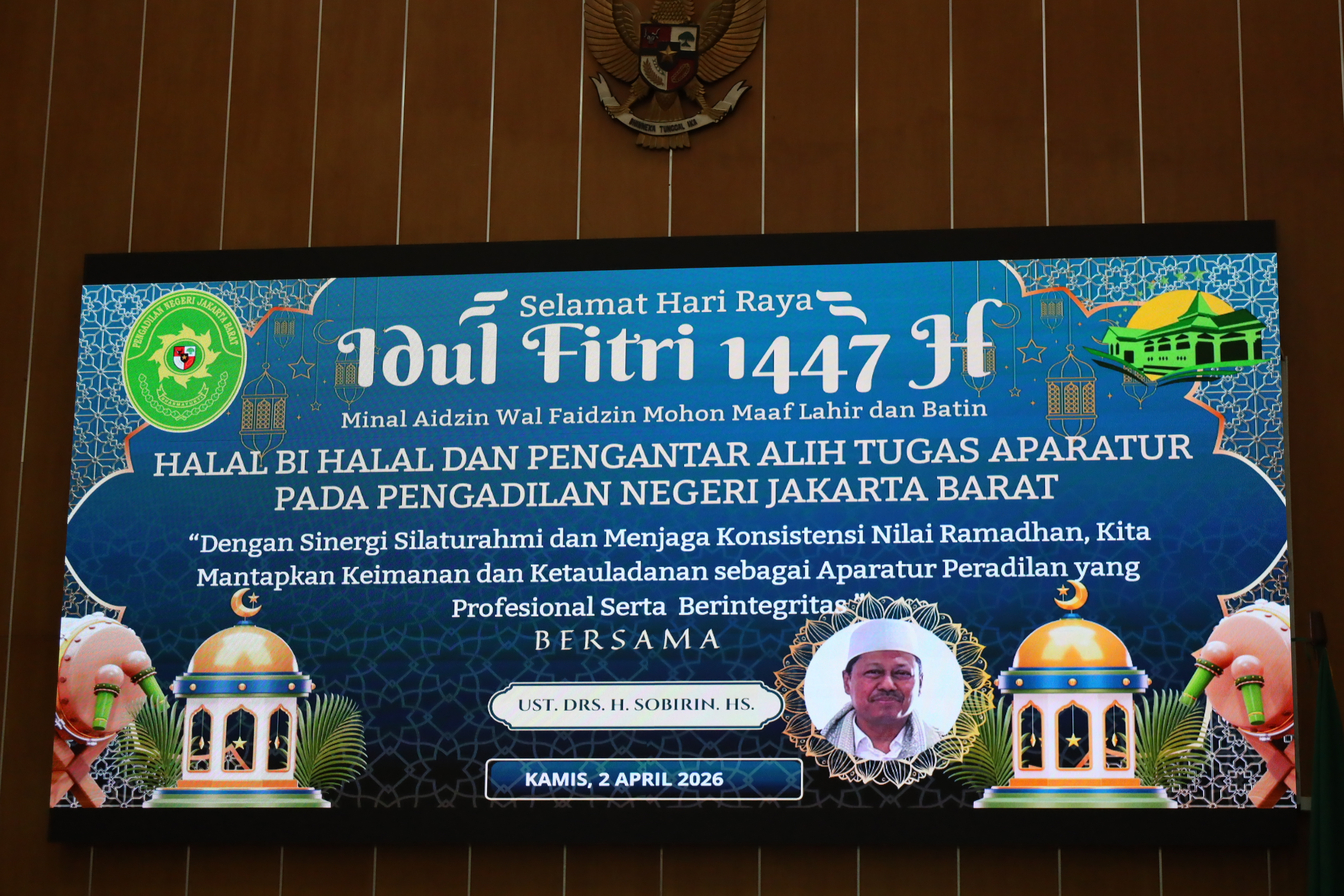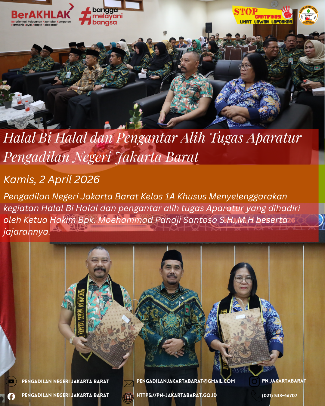 Jakarta - 2 April 2026, Bertempat di Ruang Sidang Utama Kusumah Atmadja Pengadilan Negeri Jakarta Barat Kelas IA Khusus diselenggarakan kegiatan Halal Bi Halal dan Pengantar Alih Tugas Aparatur dengan mengusung tema “Dengan sinergi silaturahmi dan menjaga konsistensi nilai Ramadhan, kita menetapkan keimanan dan kedaulatan sebagai aparatur peradilan yang profesional serta berintegritas.” Kegiatan ini dilaksanakan dengan penuh khidmat dan diikuti oleh seluruh hakim, Aparatur Sipil Negara dan Keluarga Besar Pengadilan Negeri Jakarta Barat Kelas IA Khusus.