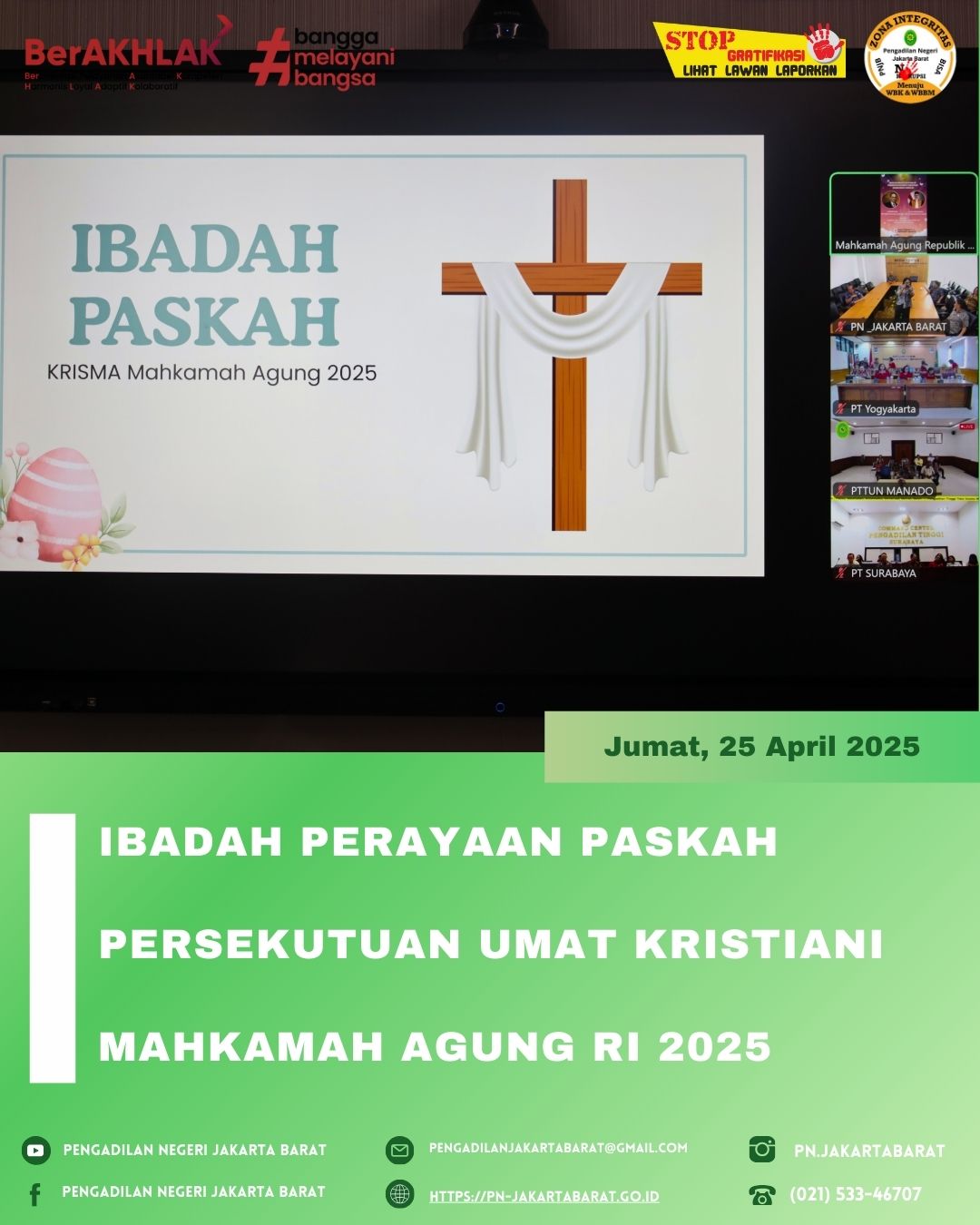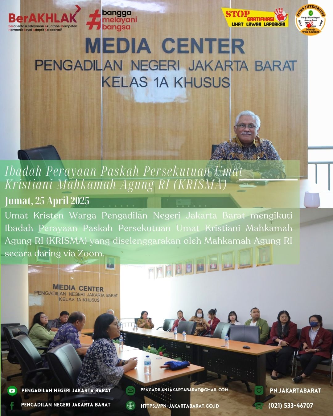 *PNJB, 25 April 2025* - Umat Kristen Warga Pengadilan Negeri Jakarta Barat Kelas IA Khusus mengikuti Ibadah Perayaan Paskah Persekutuan Umat Kristiani Mahkamah Agung RI (KRISMA) yang diselenggarakan oleh Mahkamah Agung RI secara daring via Zoom.