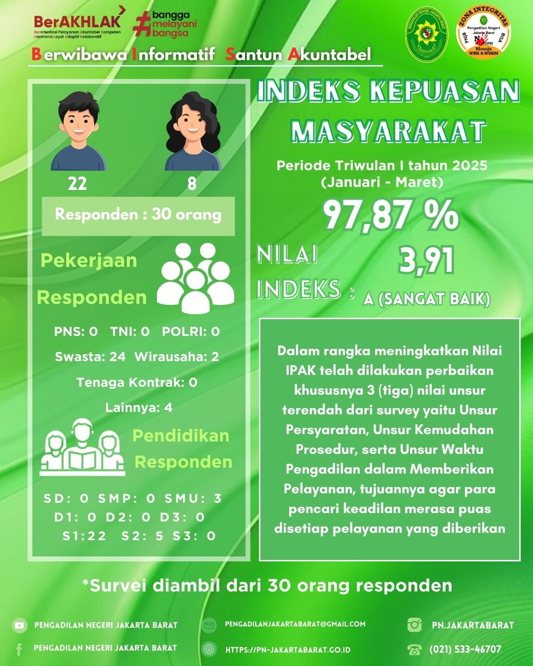 Indeks Kepuasan Masyarakat Pengadilan Negeri Jakarta Barat Kelas 1A Khusus, periode Triwulan Ke-I, Januari s/d Maret 2025, sebesar 97,87%, dengan Nilai Indeks 3,91 (Sangat Baik), diperoleh dari total responden sebanyak 30 Orang.