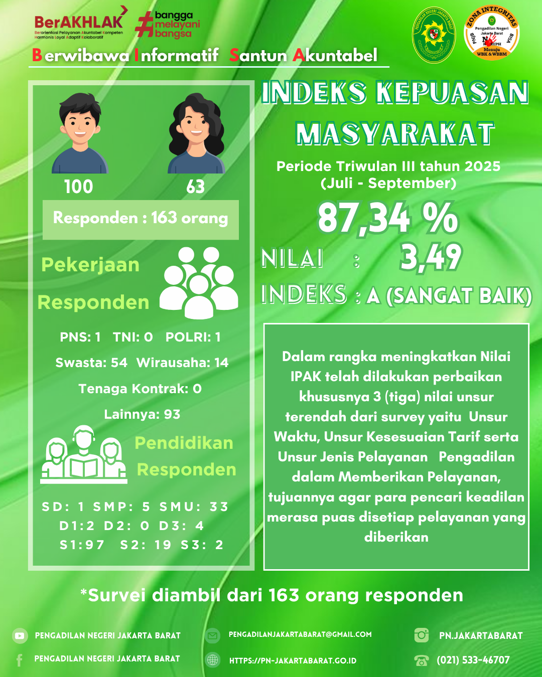 Indeks Kepuasan Masyarakat Pengadilan Negeri Jakarta Barat Kelas IA Khusus, periode Triwulan Ke-III, Juli s/d September 2025, sebesar 87,34%, dengan Nilai Indeks 3,49 (Sangat Baik), diperoleh dari total responden sebanyak 163 Orang.