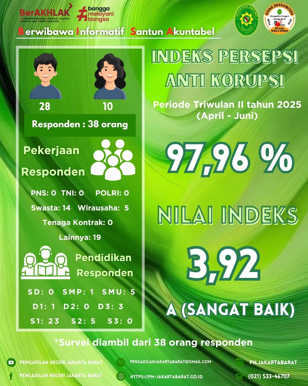 Nilai Indeks Persepsi Anti Korupsi Pengadilan Negeri Jakarta Barat Kelas IA Khusus, Periode Triwulan Ke-II, April s/d Juni 2025, adalah sebesar 97,96 % dengan Nilai Indeks 3,92 A (Sangat Baik), dari total responden sebanyak 38 Orang.