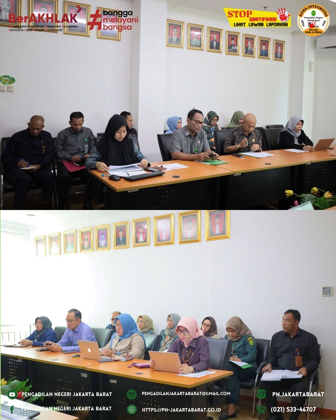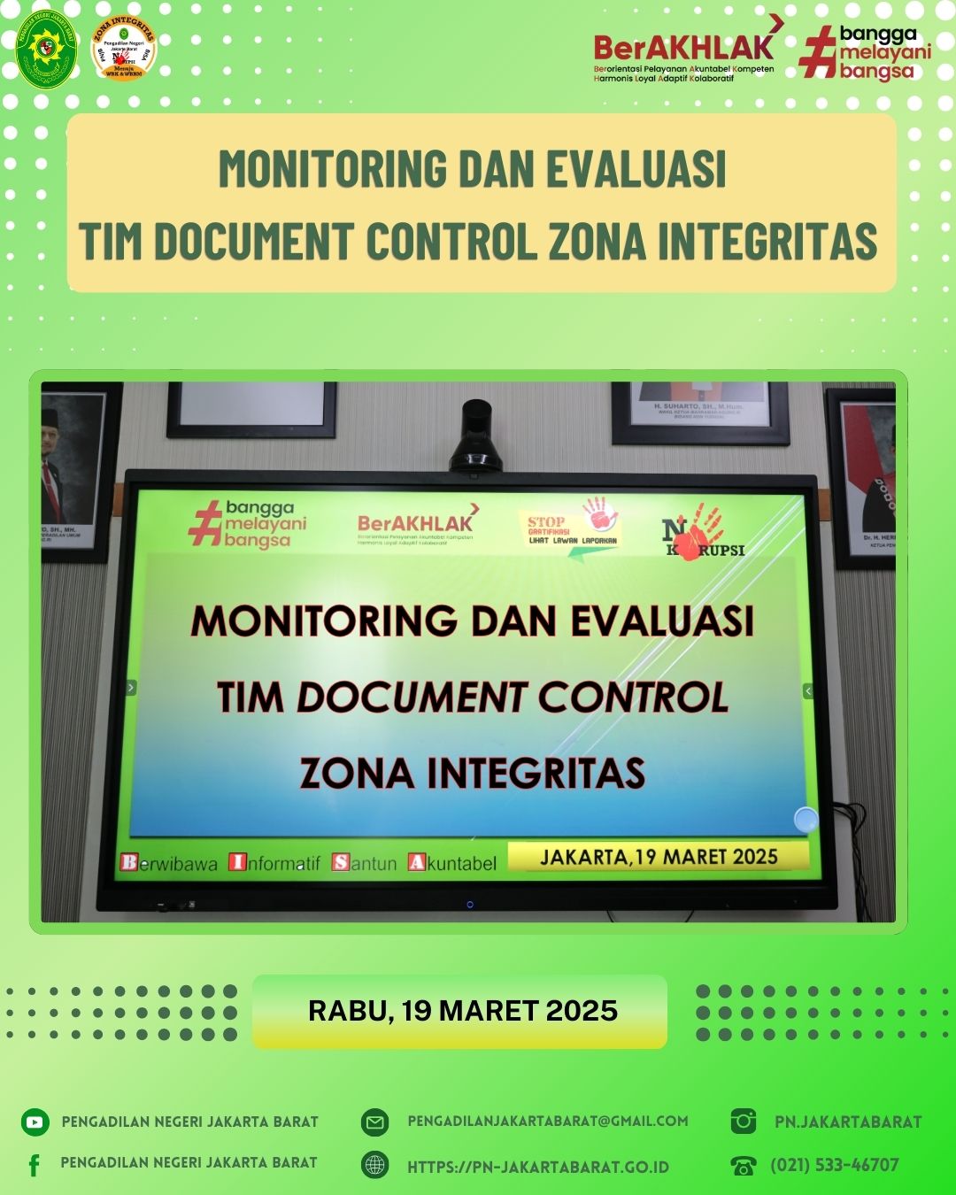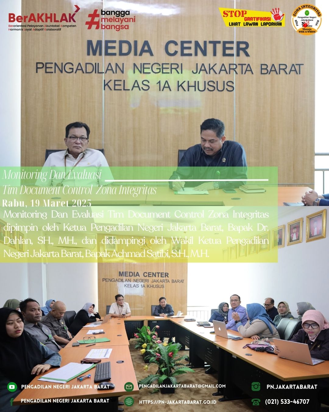 *PNJB, 19 Maret 2025* - Monitoring Dan Evaluasi Tim Document Control Zona Integritas dipimpin oleh Ketua Pengadilan Negeri Jakarta Barat, Bapak Dr. Dahlan, SH., MH., dan didampingi oleh Wakil Ketua Pengadilan Negeri Jakarta Barat, Bapak Achmad Satibi, S.H., M.H. yang dihadiri oleh Hakim Koordinator tiap area, Panitera, Sekretaris, Para Panitera Muda dan Kepala Sub Bagian serta seluruh Tim Document Control Zona Integritas (ZI).