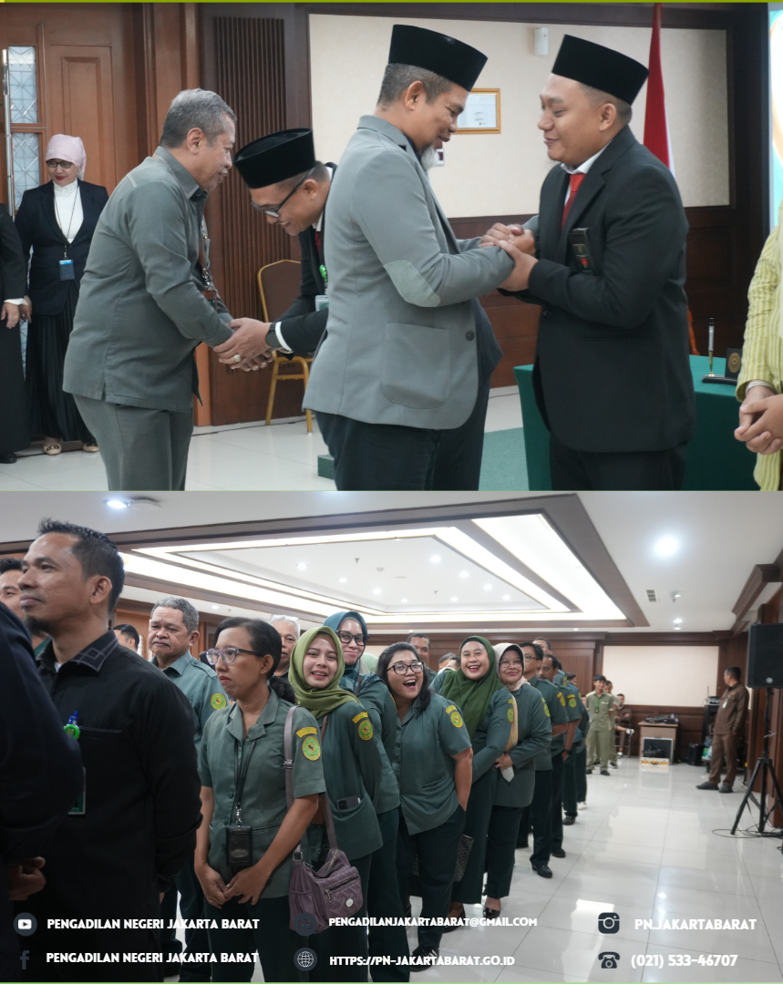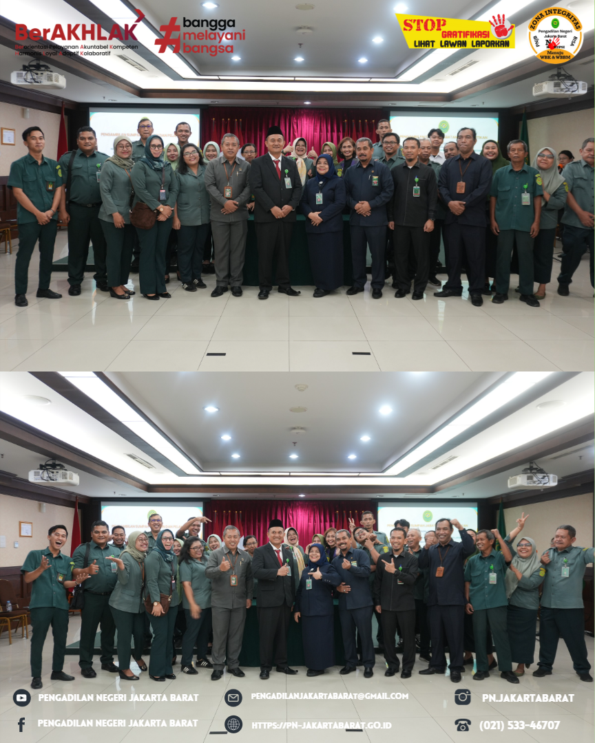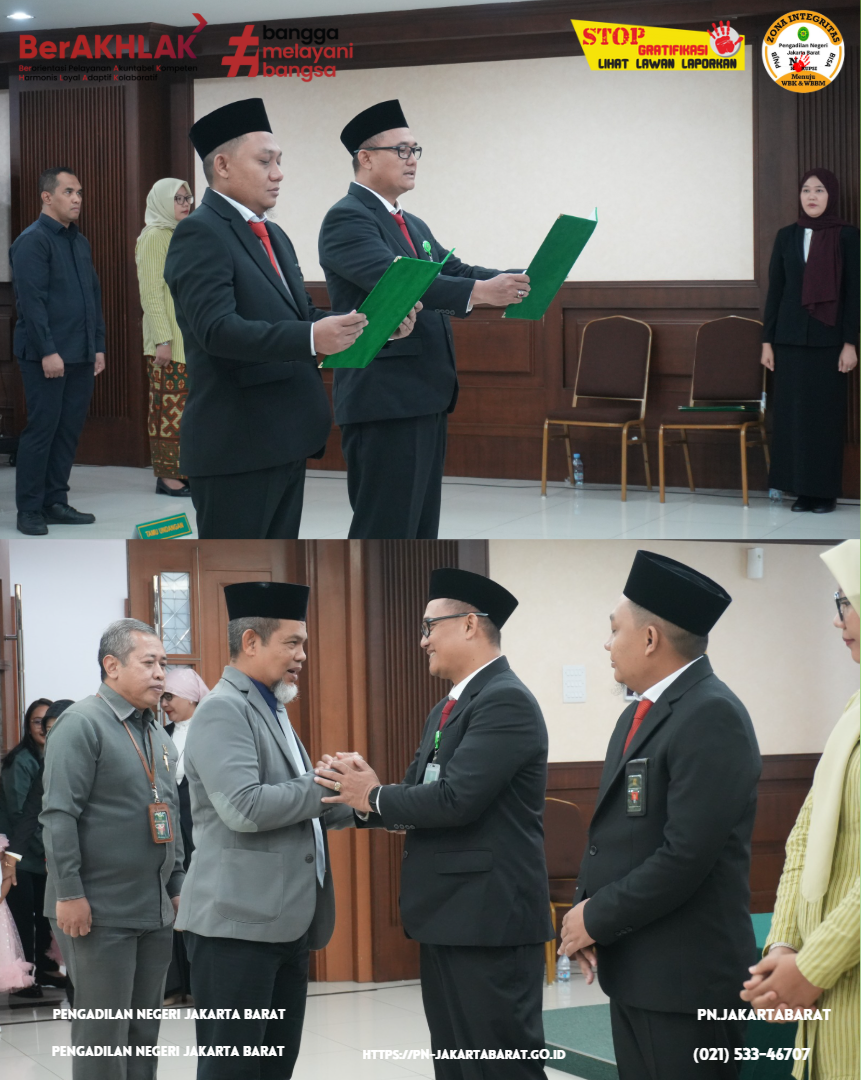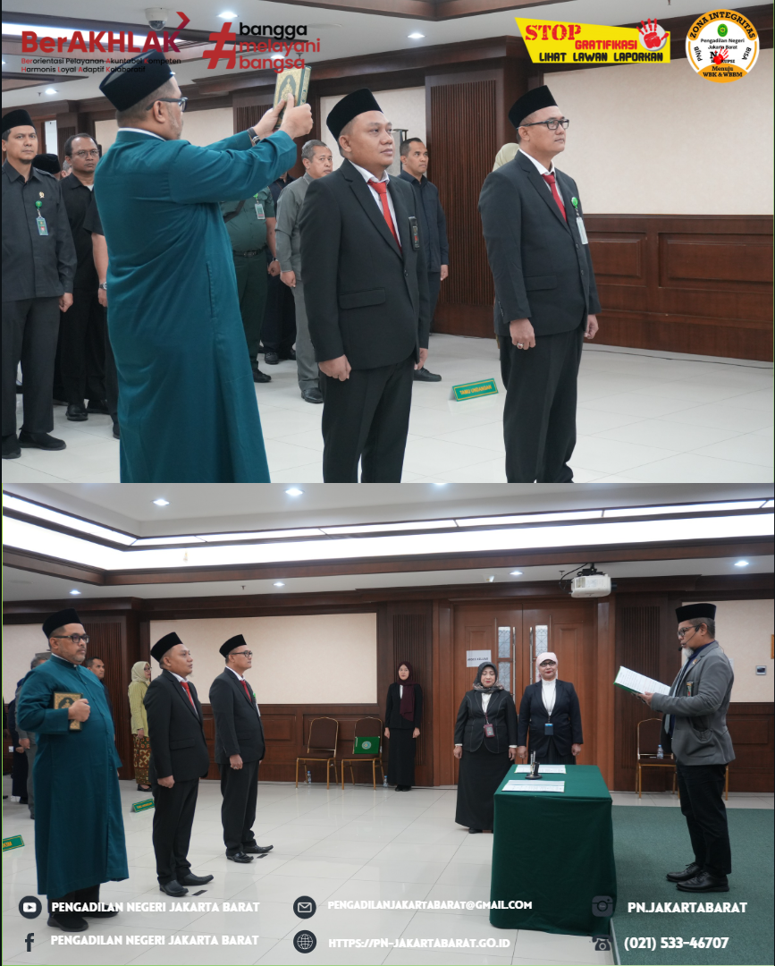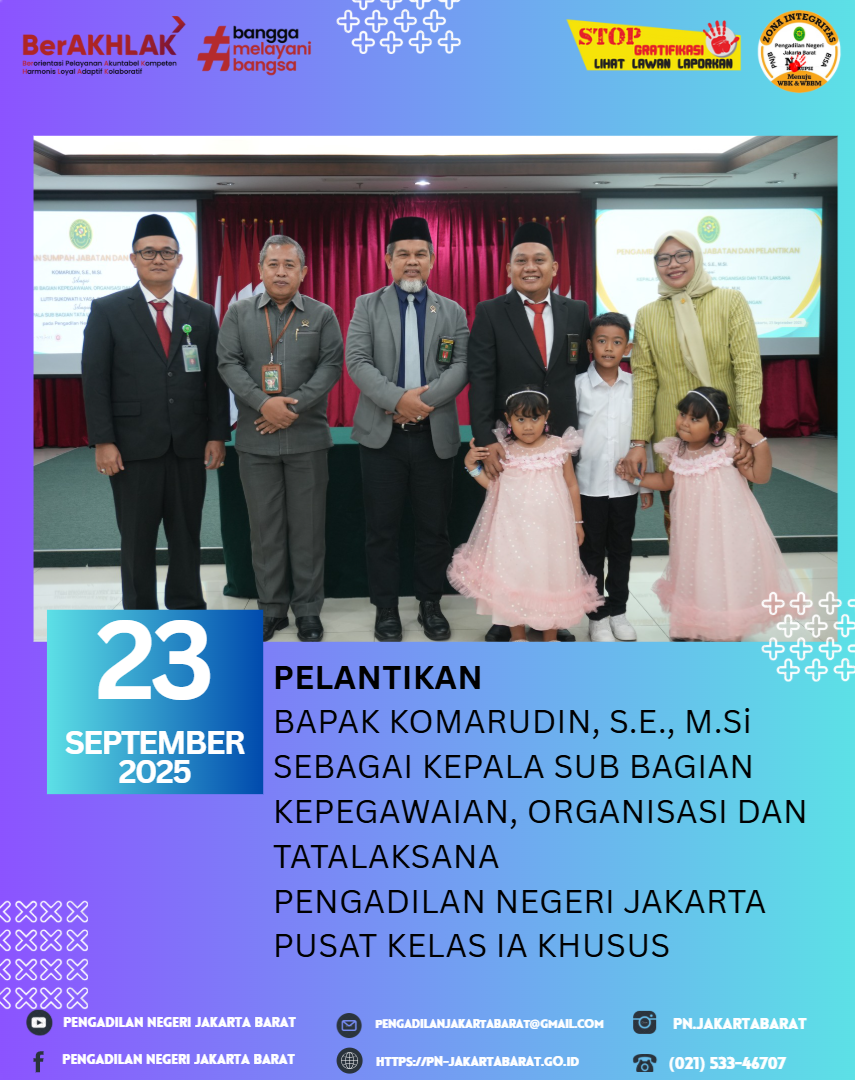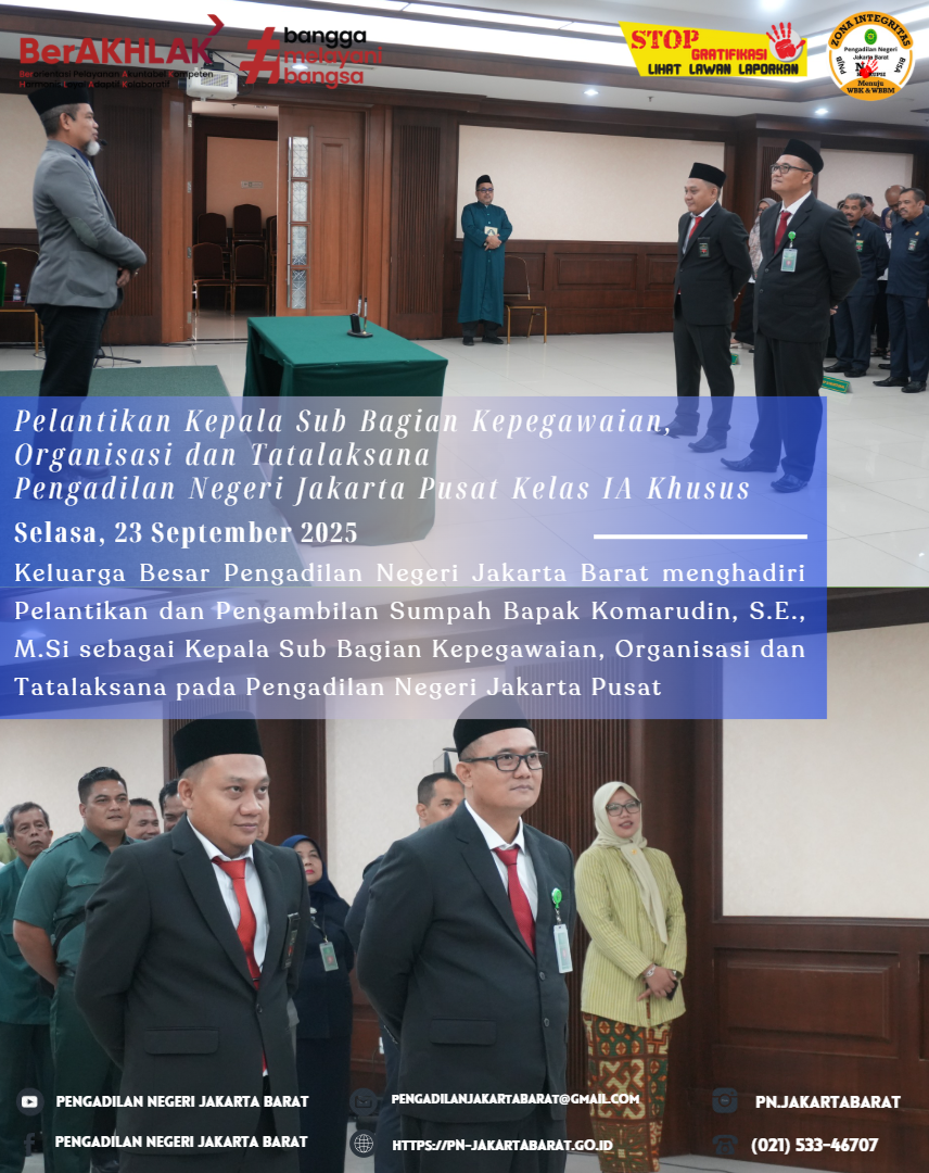 Pengadilan Negeri Jakarta Pusat Kelas IA Khusus menyelenggarakan pelantikan dan pengambilan sumpah Bapak Komarudin, S.E., M.Si., sebagai Kepala Sub Bagian Kepegawaian, Organisasi dan Tata Laksana, Pak Komarudin, S.E., M.Si sebelumnya adalah Kepala Sub Bagian Tata Usaha dan Keuangan Pengadilan Negeri Jakarta Barat.