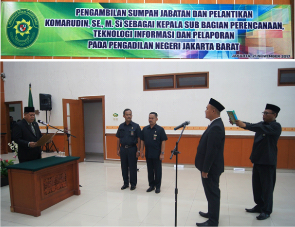 Pelantikan dipimpin langsung oleh Bapak H. Sumpeno, SH., MH selaku Ketua Pengadilan Negeri Jakarta Barat . Setelah pelantikan dilanjutkan dengan menyanyikan lagu Padamu Negeri serta dilanjutkan dengan pembacaan dan penandatanganan Pakta Integritas oleh Bapak Komarudin, SE., MSi dihadapan Ketua Pengadilan Negeri Jakarta Barat.