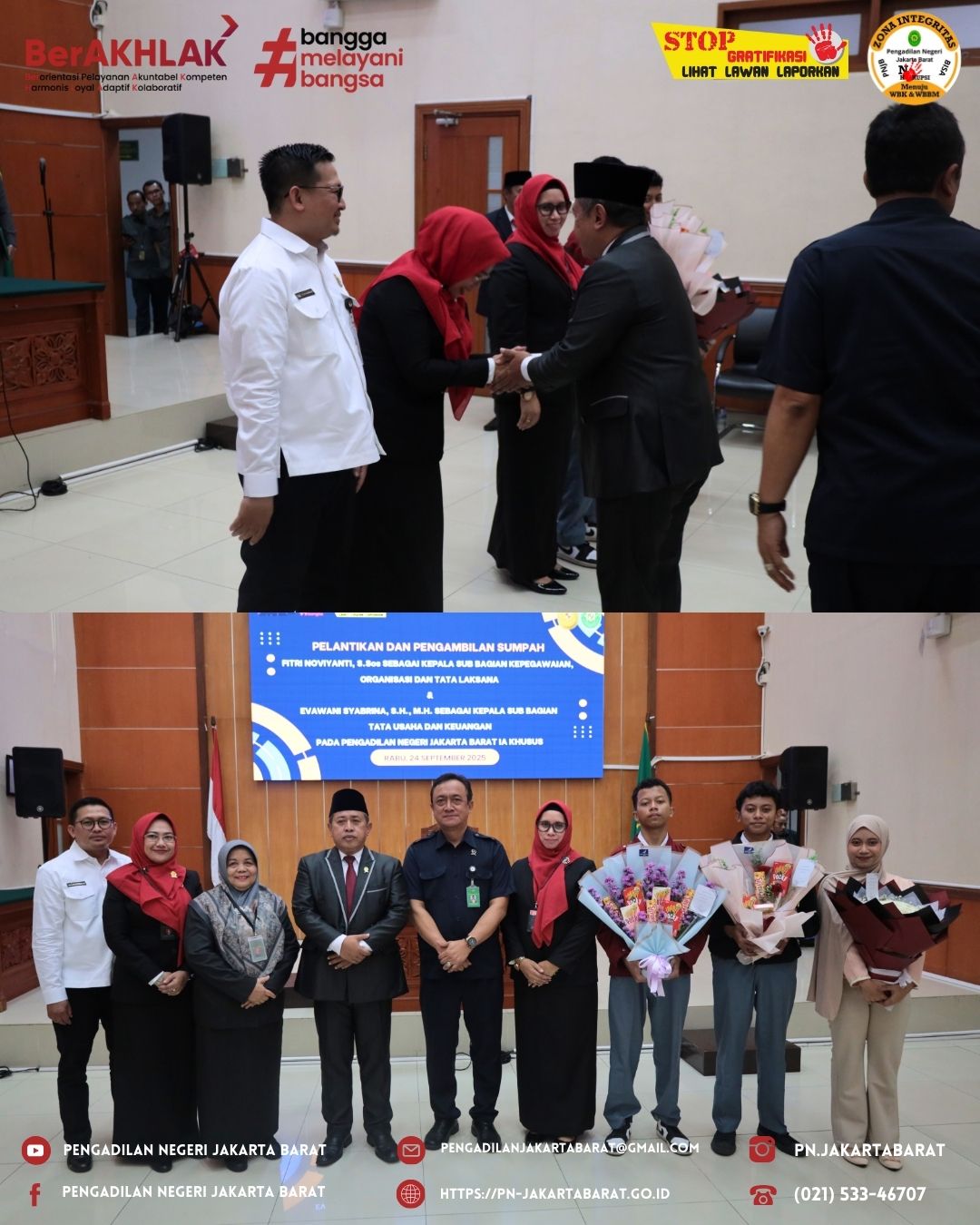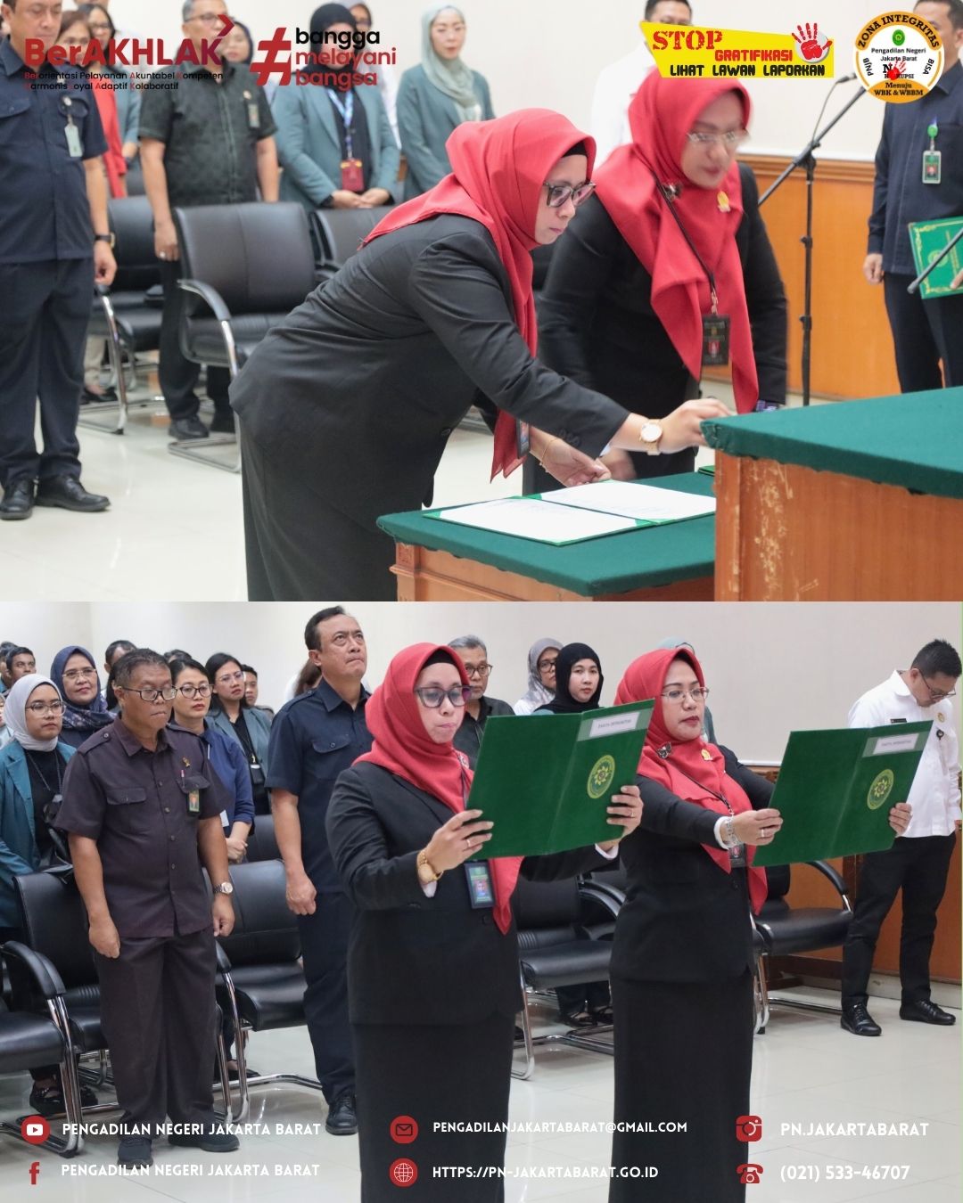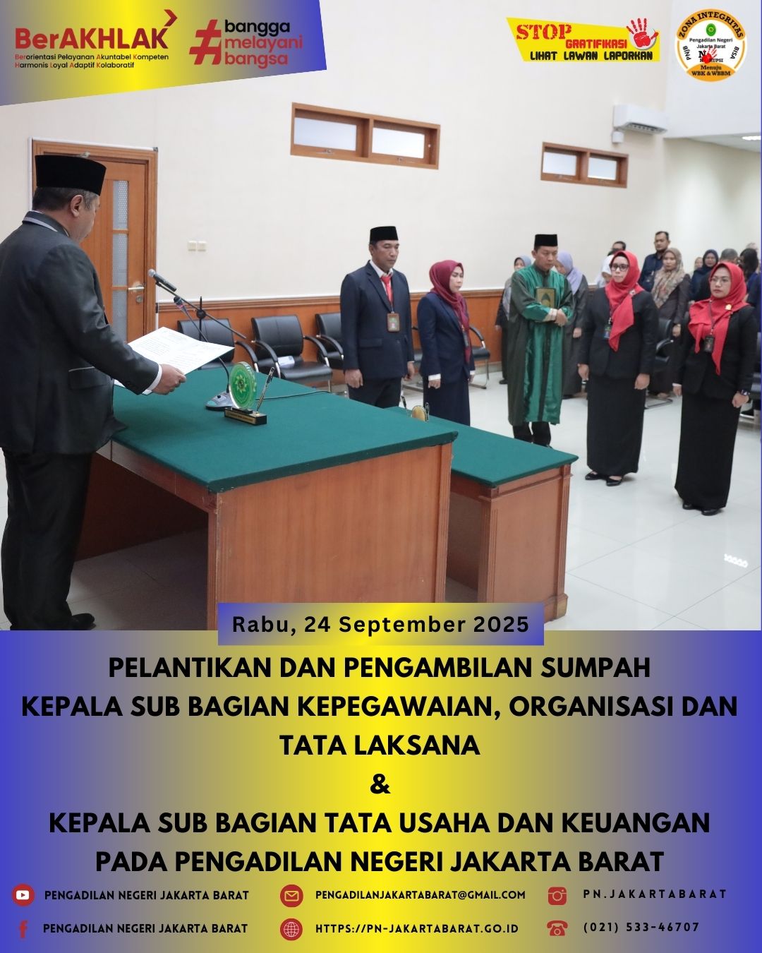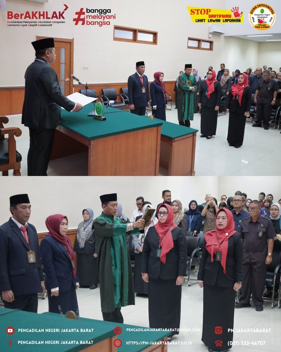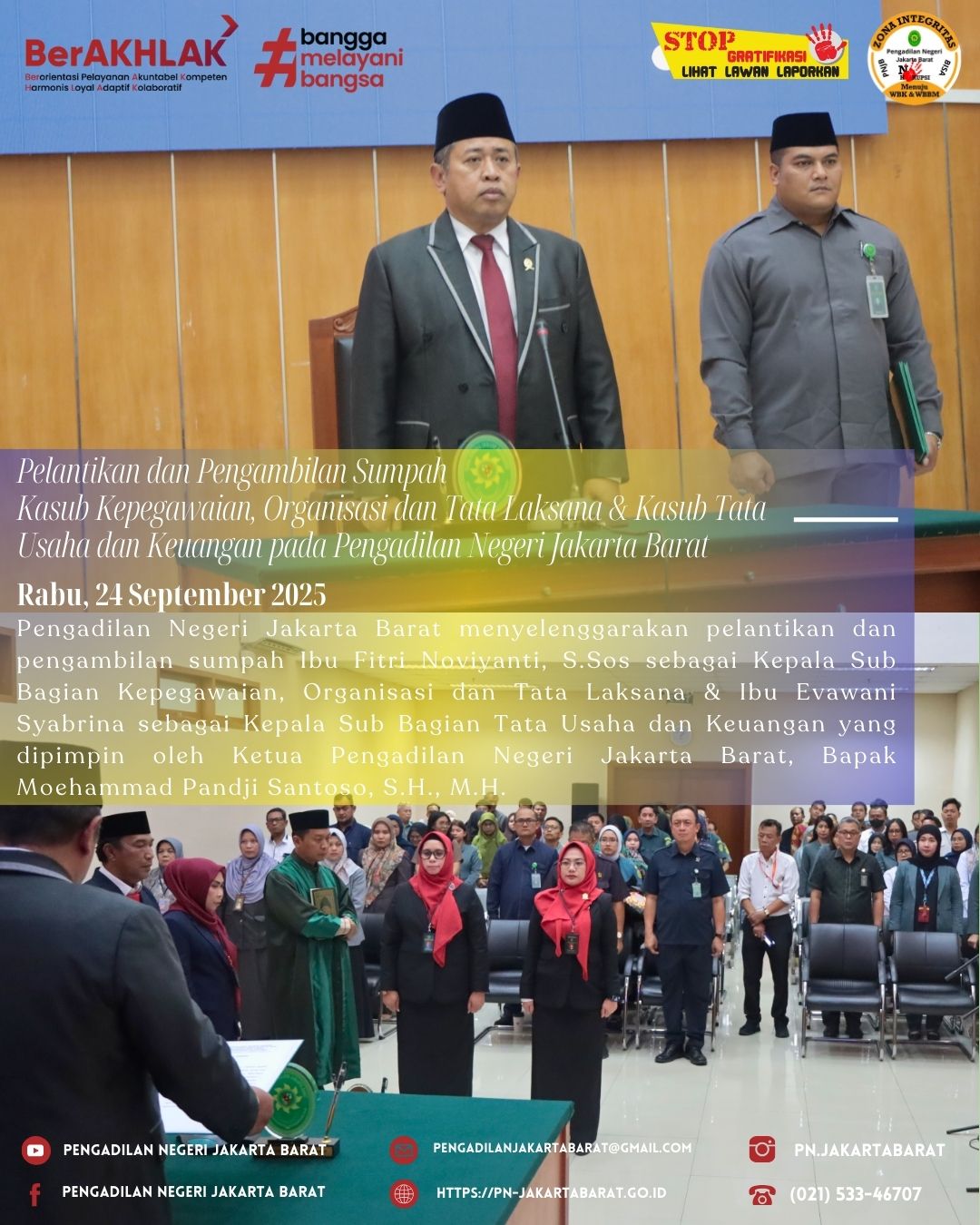 Pengadilan Negeri Jakarta Barat Kelas IA Khusus menyelenggarakan pelantikan dan pengambilan sumpah Ibu Fitri Noviyanti S.Sos., sebagai Kepala Sub Bagian Kepegawaian, Organisasi dan Tata Laksana & Ibu Evawani Syabrina S.H., M.H., sebagai Kepala Sub Bagian Tata Usaha dan Keuangan yang dipimpin oleh Ketua Pengadilan Negeri Jakarta Barat Kelas IA Khusus, Bapak Moehammad Pandji Santoso, S.H., M.H.