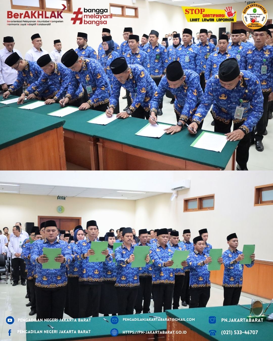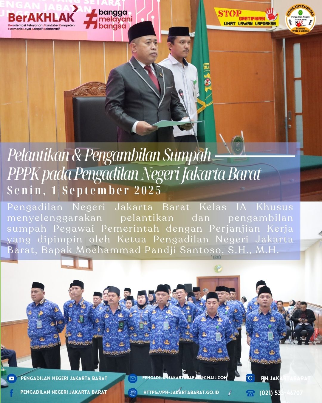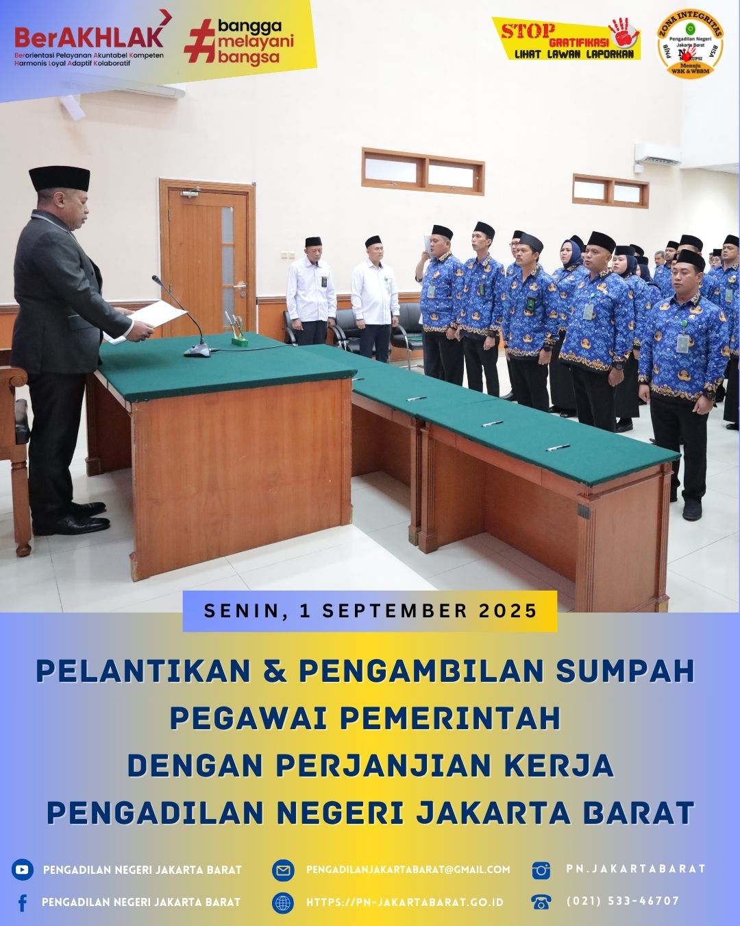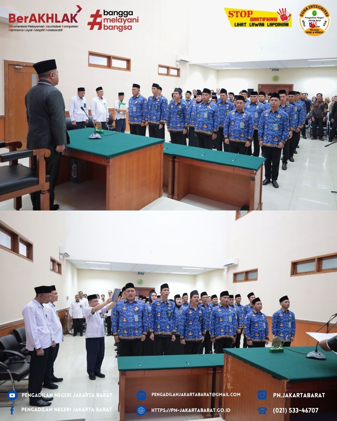 Pengadilan Negeri Jakarta Barat Kelas IA Khusus menyelenggarakan pelantikan dan pengambilan sumpah Pegawai Pemerintah dengan Perjanjian Kerja yang dipimpin oleh Ketua Pengadilan Negeri Jakarta Barat, Bapak Moehammad Pandji Santoso, S.H., M.H.