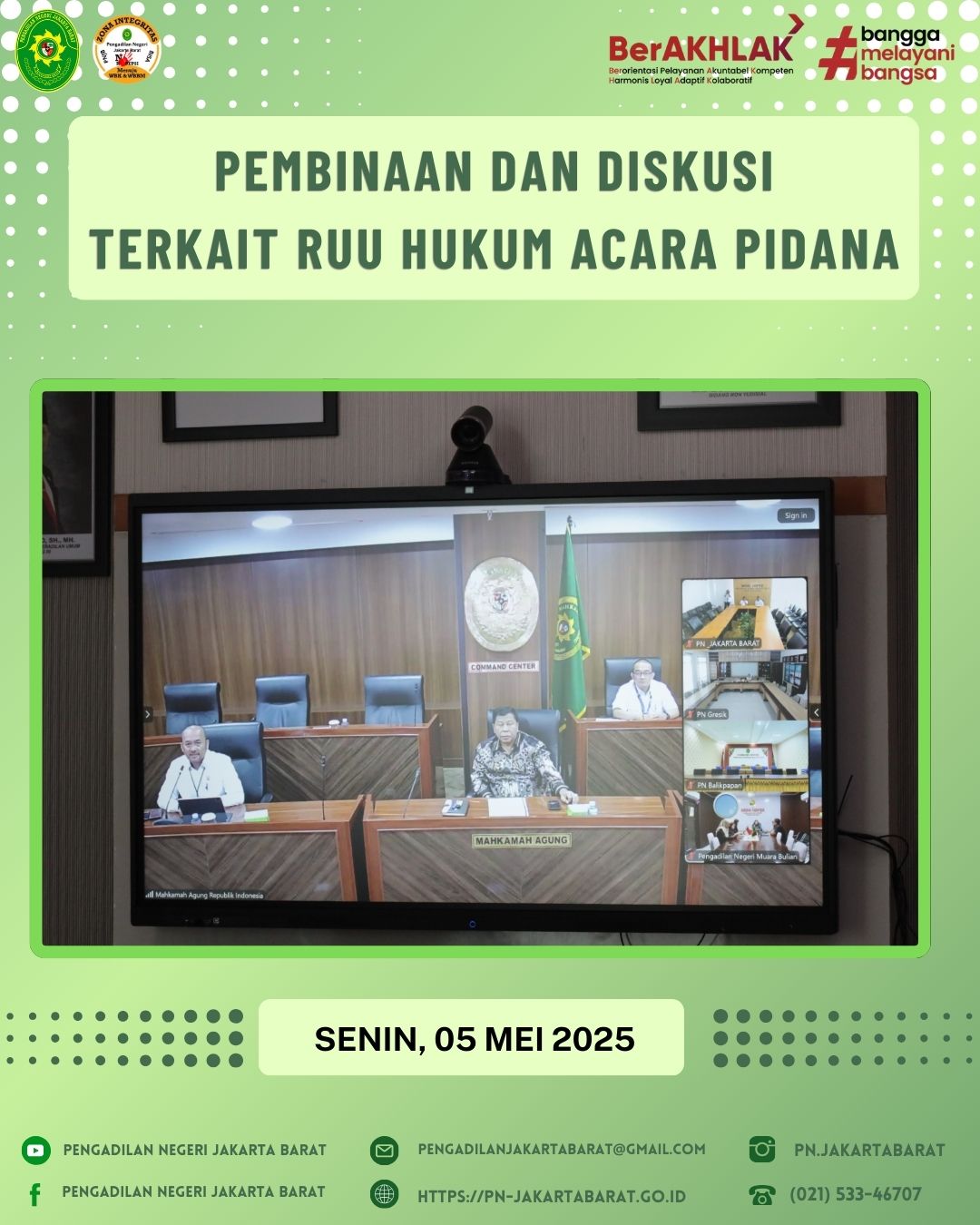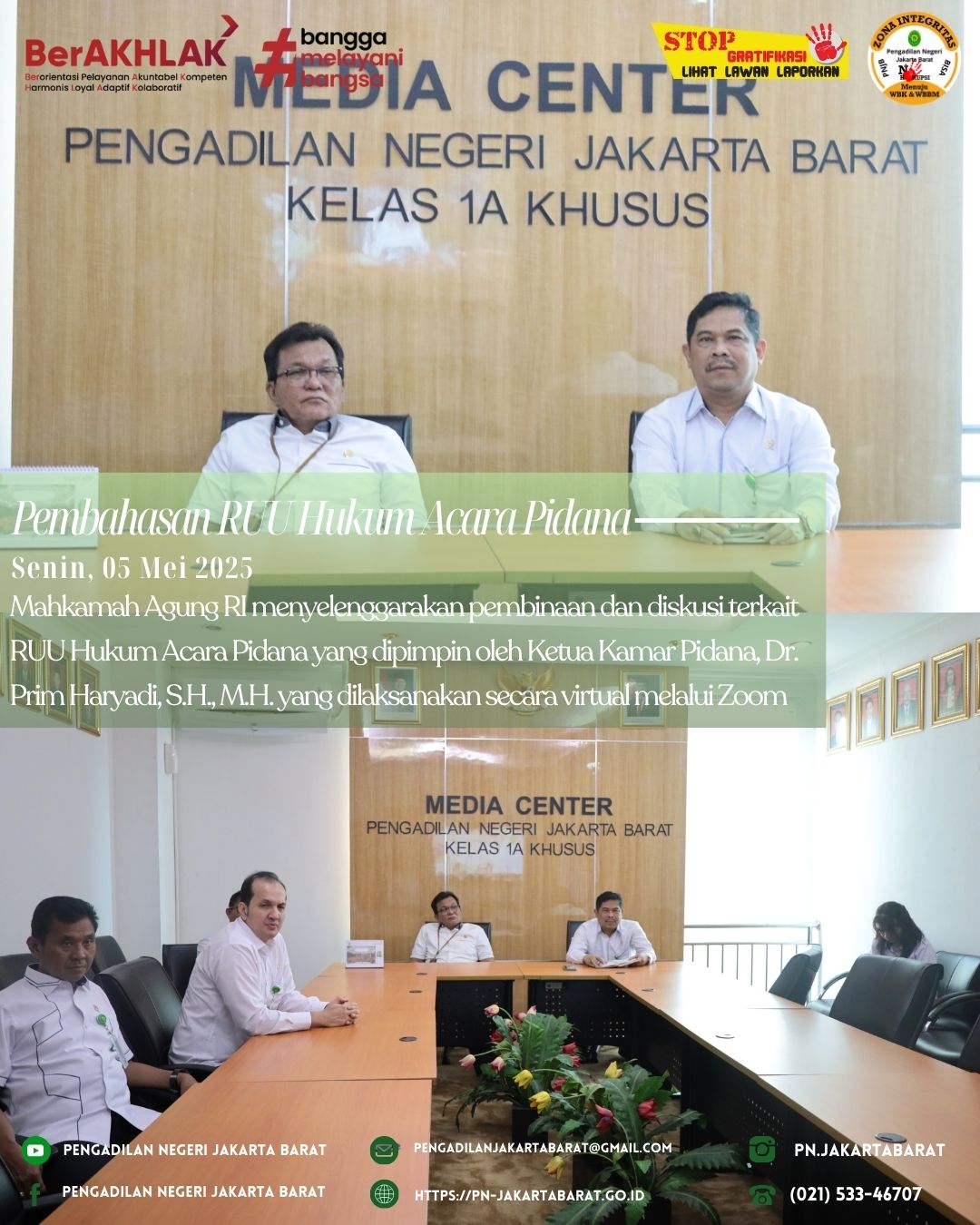 *PNJB, 05 Mei 2025* - Para Hakim Pengadilan Negeri Jakarta Barat menghadiri kegiatan pembinaan dan diskusi terkait RUU Hukum Acara Pidana yang dipimpin oleh Ketua Kamar Pidana Mahkamah Agung Republik Indonesia, Bapak Dr. Prim Haryadi, S.H., M.H. yang dilaksanakan secara virtual melalui Zoom.