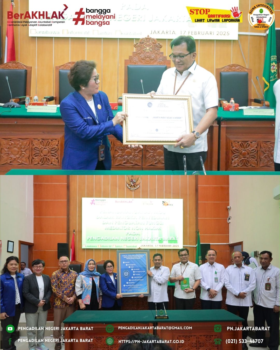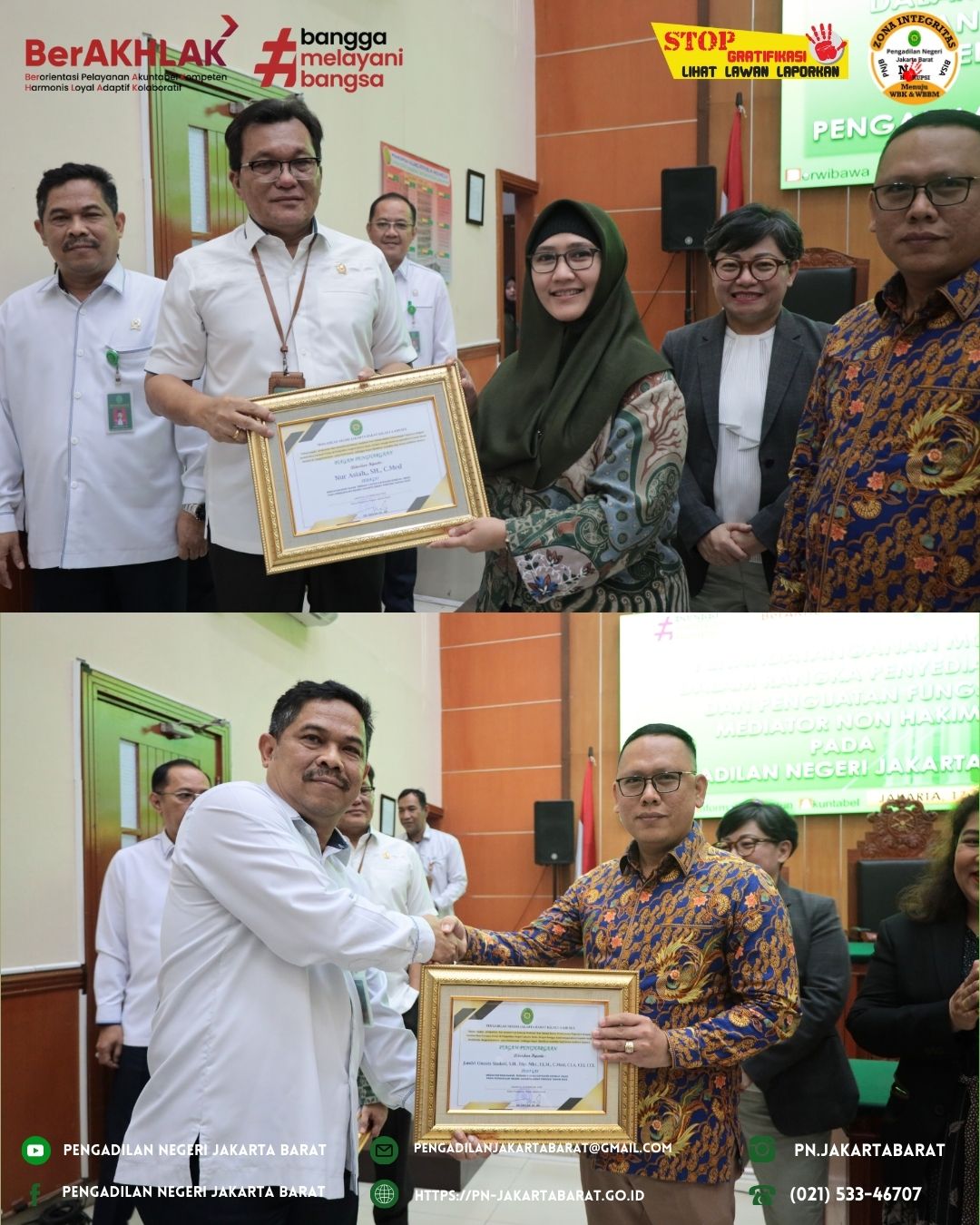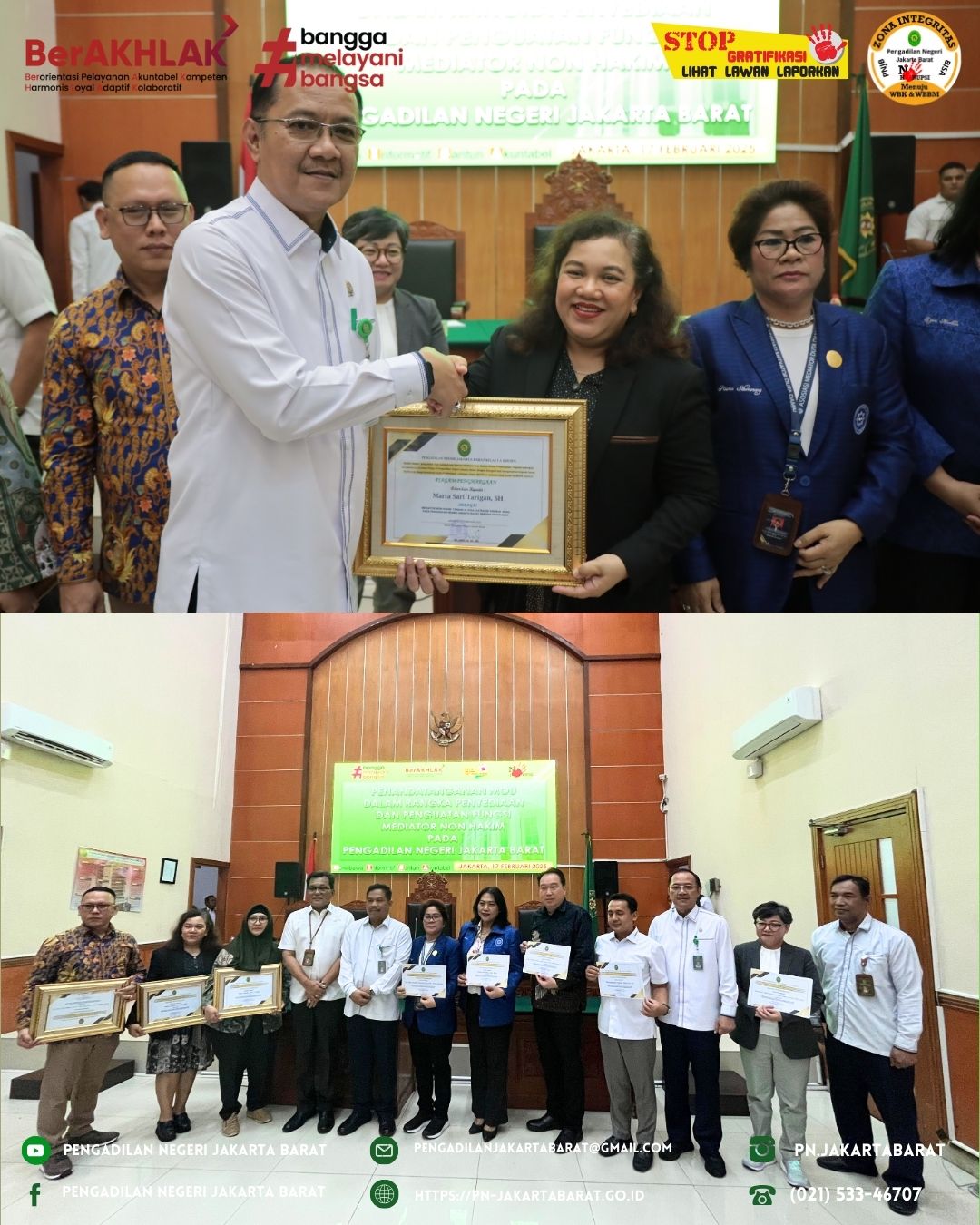Dari Asosiasi Mediator Duta Damai Indonesia memberikan Piagam Penghargaan kepada Pengadilan Negeri Jakarta Barat dan juga Pengadilan Negeri Jakarta Barat memberikan Piagam Penghargaan kepada Mediator Non Hakim Pengadilan Negeri Jakarta Barat yang telah memberikan prestasi dan dedikasi kerja terbaik selama tahun 2024.