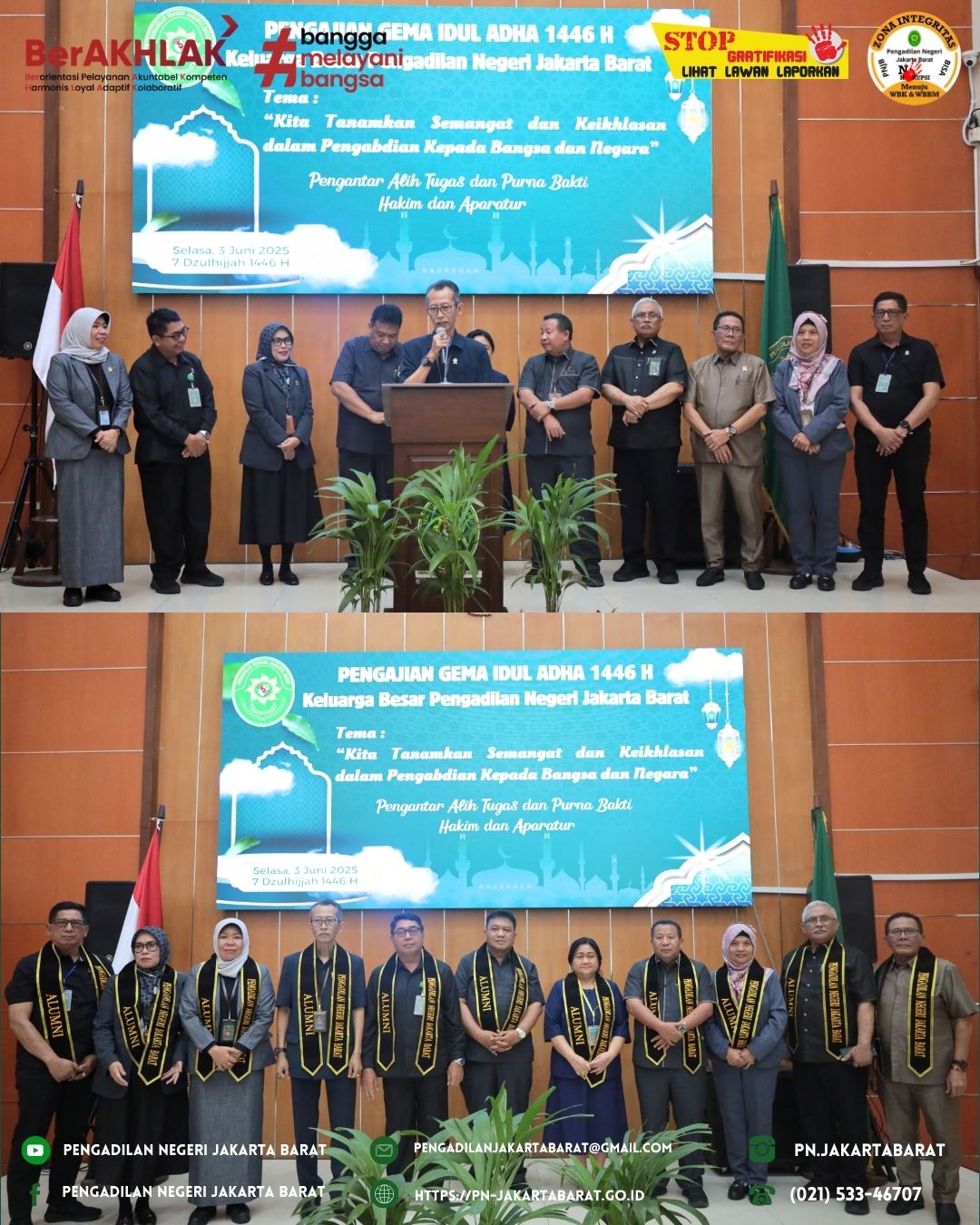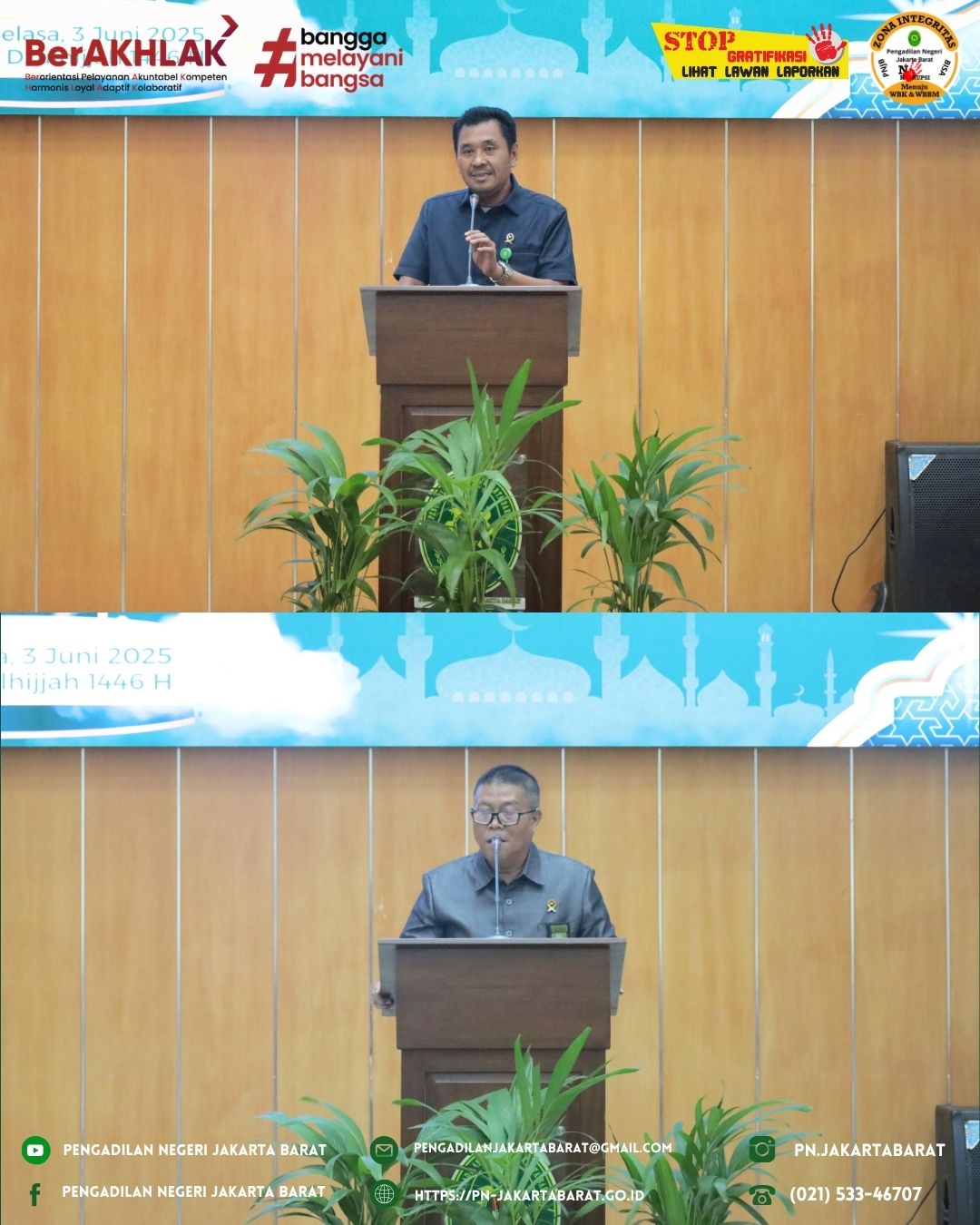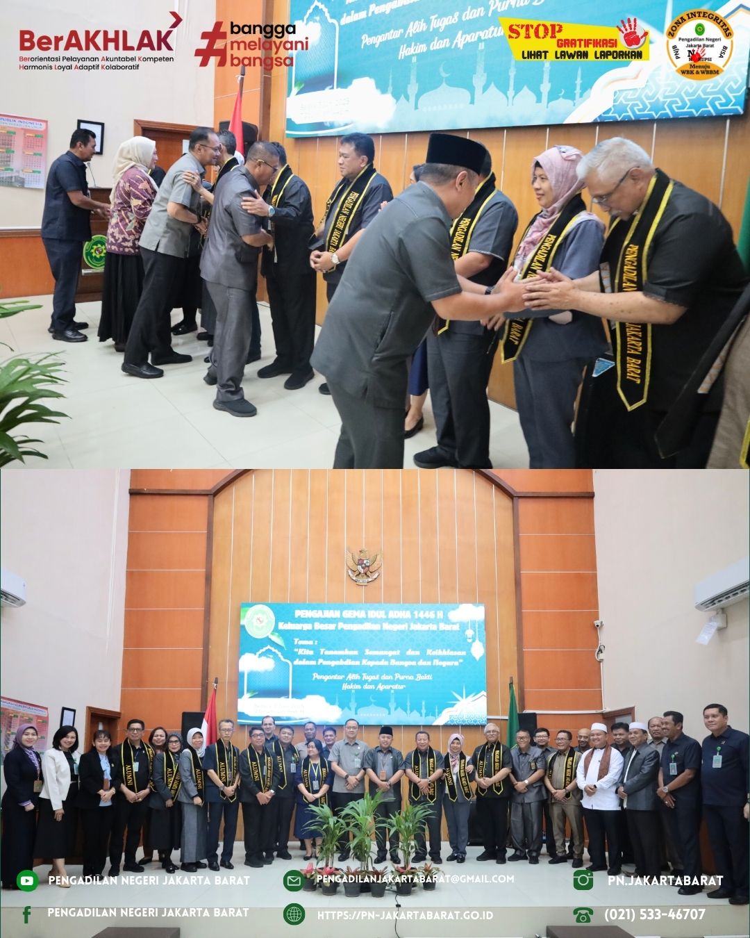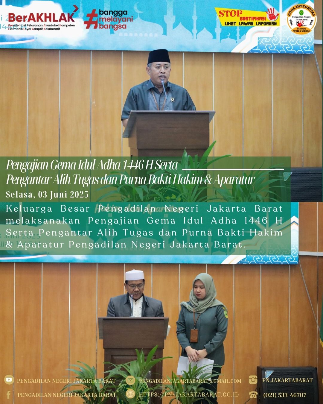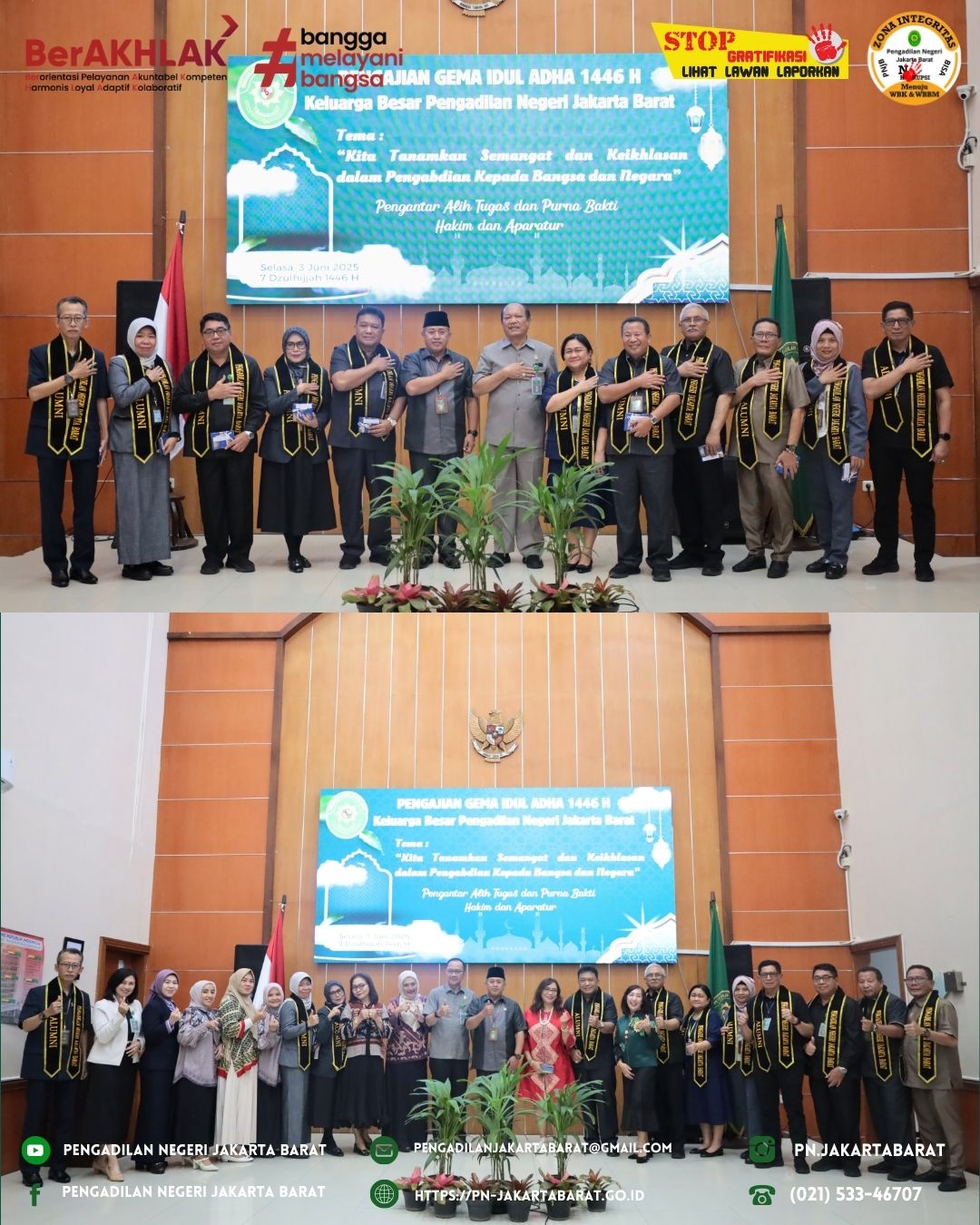 *PNJB, 03 Juni 2025* - Keluarga Besar Pengadilan Negeri Jakarta Barat melaksanakan Pengajian Gema Idul Adha 1446 H Serta Pengantar Alih Tugas dan Purna Bakti Hakim & Aparatur Pengadilan Negeri Jakarta Barat.