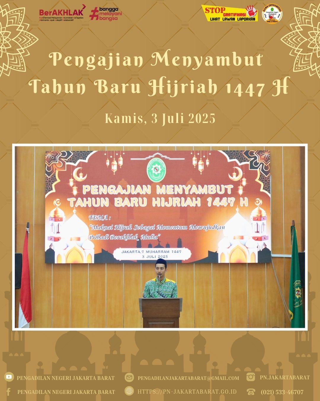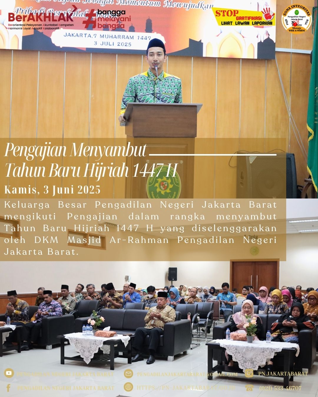 *PNJB, 3 Juli 2025* - Keluarga Besar Pengadilan Negeri Jakarta Barat mengikuti Pengajian dalam rangka menyambut Tahun Baru Hijriah 1447 H yang diselenggarakan oleh DKM Masjid Ar-Rahman Pengadilan Negeri Jakarta Barat.